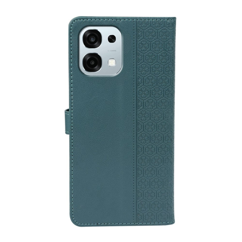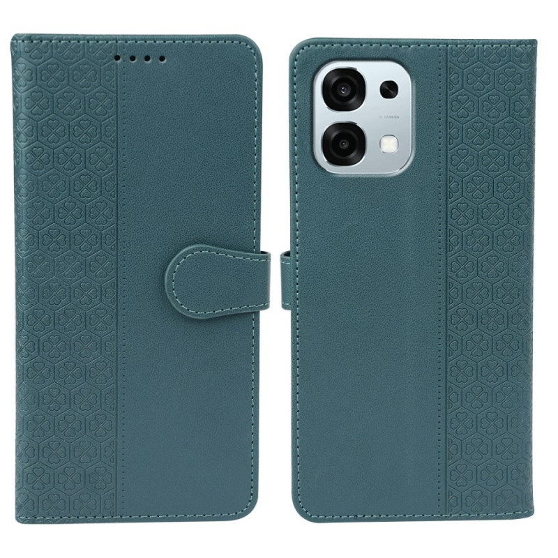 Capa elegante em pele PU para o Oppo A6 Pro 5G com fecho magnético seguro. Design requintado em forma de trevo de quatro folhas, 3 ranhuras para cartões e bolso para notas. Função de suporte integrada para uma visualização confortável.