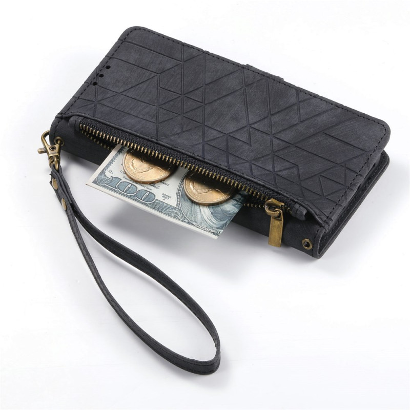 Proteja o seu smartphone com estilo com esta capa multifunções para carteira. Com várias ranhuras para cartões, um bolso seguro com fecho de correr e uma prática alça de mão, combina estilo geométrico com proteção total.