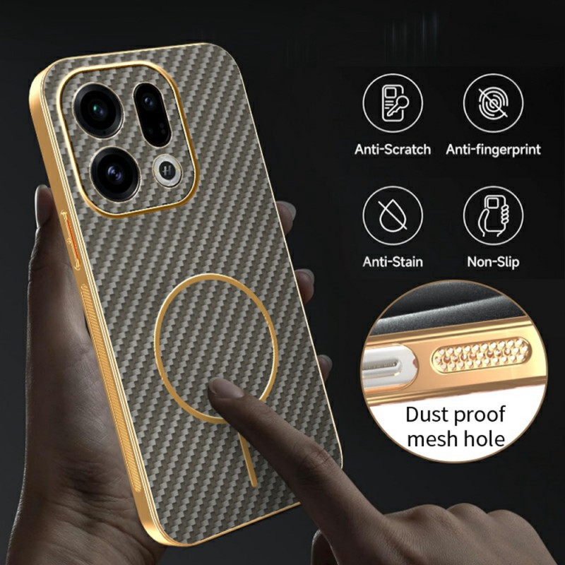 Proteja o seu Oppo Find X9 5G com estilo com esta capa TPU com textura de fibra de carbono. O seu acabamento eletrolítico de qualidade superior oferece uma proteção óptima contra os impactos e resiste às impressões digitais. Design requintado e ajuste perfeito.