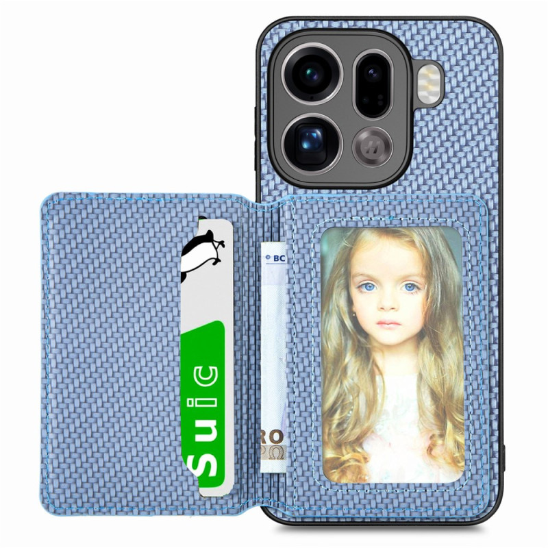 Capa premium para o Oppo Find X9 Pro 5G que combina estilo e funcionalidade. Proteção total em pele texturizada de fibra de carbono com suporte para cartões magnéticos integrado e tecnologia anti-RFID. Suporte ajustável e compatibilidade com suporte magnético para automóvel.