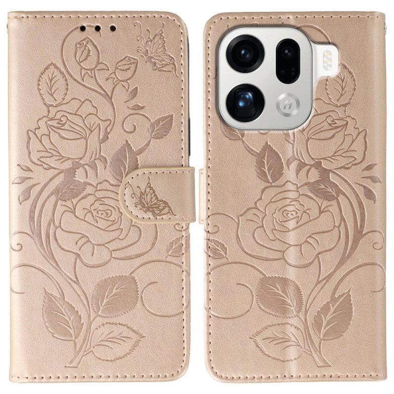 Capa elegante em pele PU com um bonito motivo de borboleta e rosa. Com 3 ranhuras para cartões, um compartimento lateral e uma prática função de suporte para utilizar o Oppo Find X9 Pro 5G em modo mãos-livres.