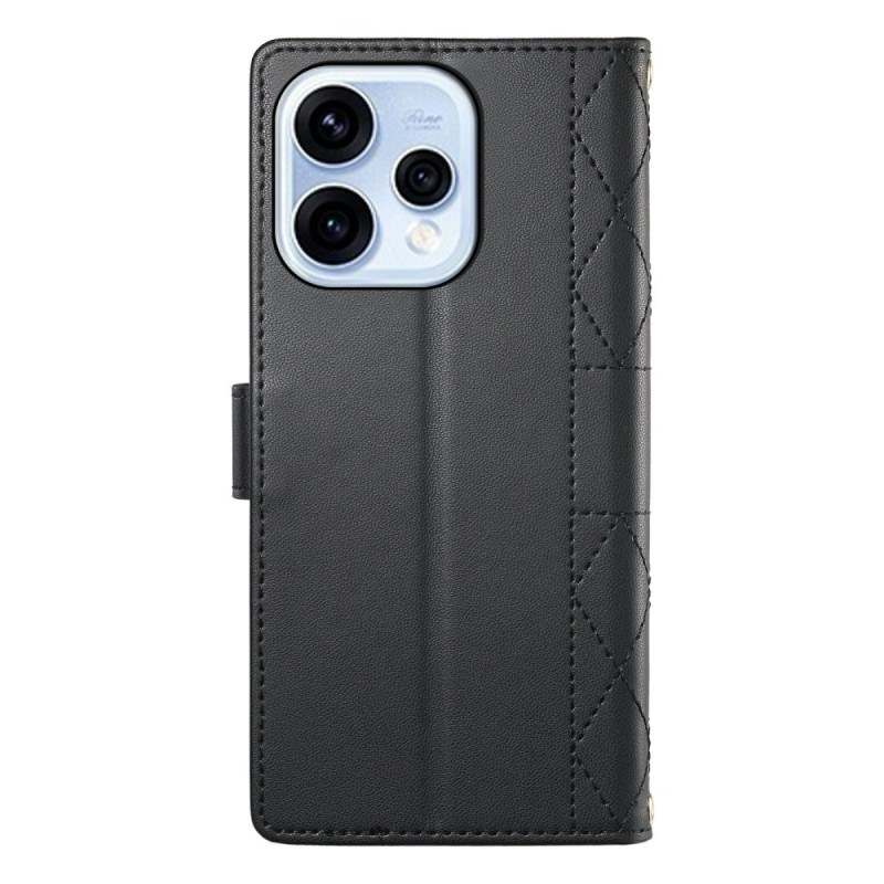 Capa elegante com design acolchoado de diamantes para o Oppo Reno 15 5G. Inclui 3 ranhuras para cartões, 1 bolso para dinheiro, função de suporte integrada e alça de ombro amovível ajustável. Proteção completa contra choques e riscos.