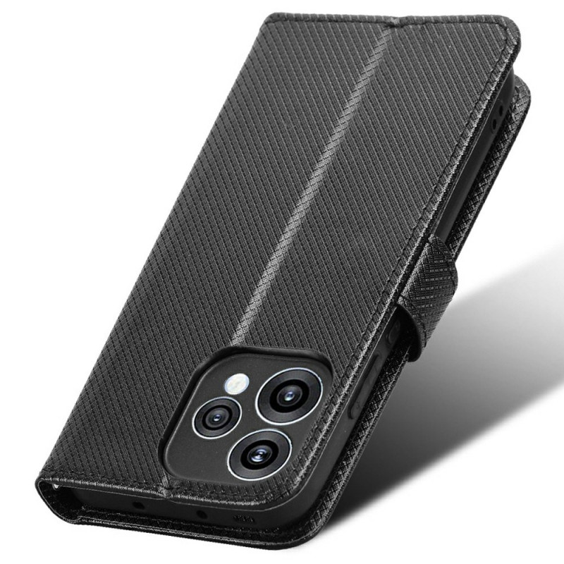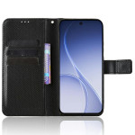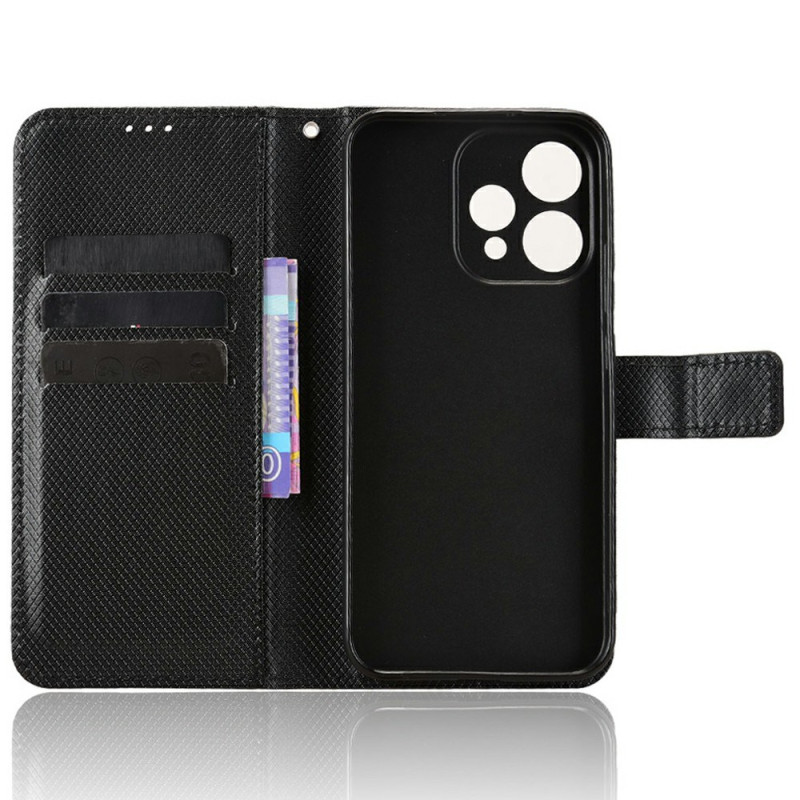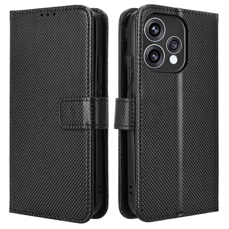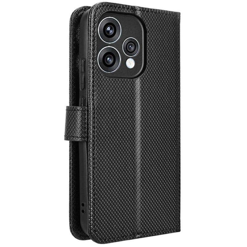 Capa elegante em pele com textura de diamante para o Oppo Reno 15 5G. Equipada com compartimentos para cartões, fecho magnético, suporte dobrável e alça de mão. Proteção total contra choques e riscos para uma utilização prática no dia a dia.
