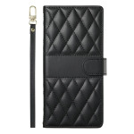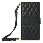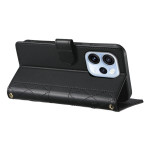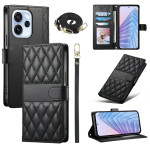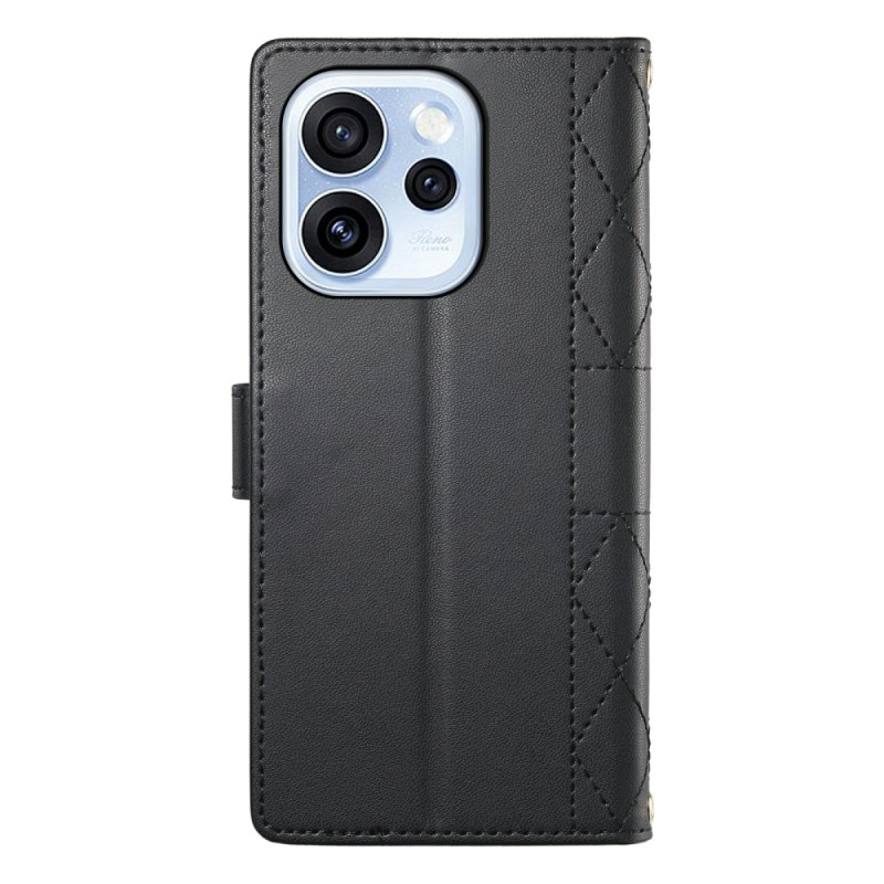 Capa elegante em pele PU com design acolchoado com diamantes para o Oppo Reno 15 F 5G. Inclui 3 ranhuras para cartões, 1 bolso para dinheiro, função de suporte integrada e alças de pulso amovíveis e ajustáveis (70-150 cm).