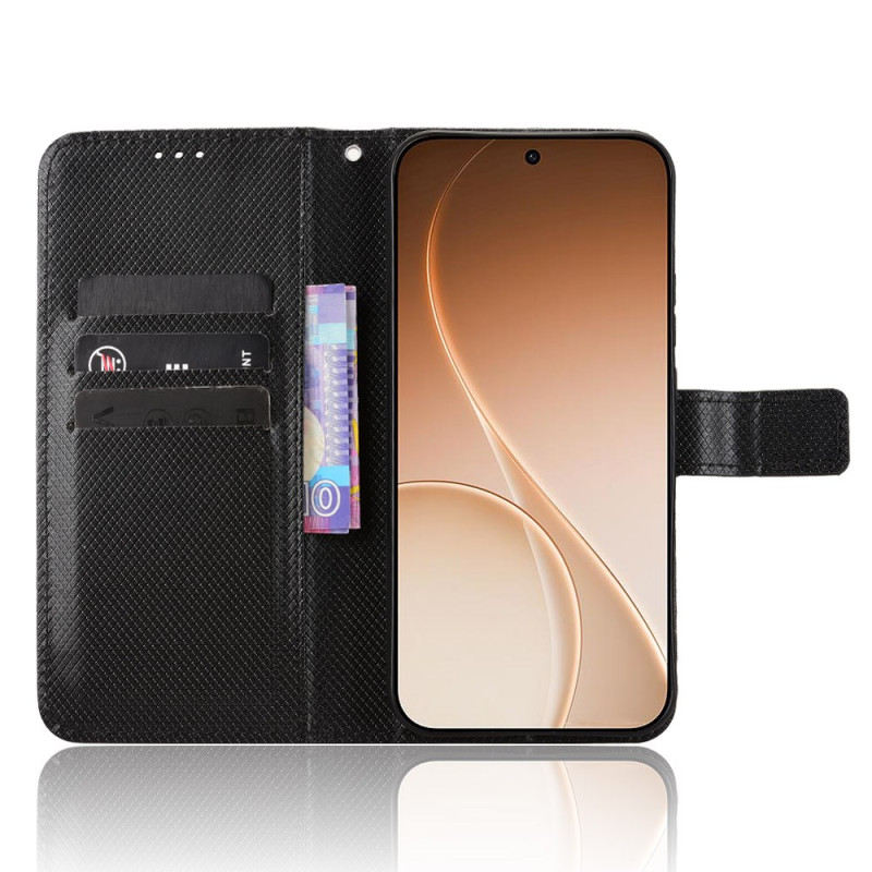 Découvrez notre étui portefeuille élégant pour Oppo Reno 15 5G / 15 FS 5G avec texture diamant raffinée. Doté de fentes pour cartes, d'un fermoir magnétique et d'un support pliable pour une expérience mains libres. La dragonne incluse facilite le transport au quotidien.
