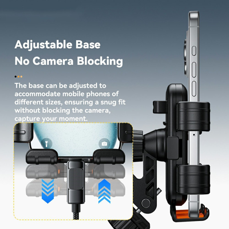 O suporte para espelho ESSAGER tem um fecho duplo para uma segurança absoluta e facilidade de utilização. Concebido para motociclistas e ciclistas, garante a estabilidade do seu smartphone (4,7 a 6,9 polegadas) graças ao seu mecanismo antiderrapante em borracha e ao sistema de fixação reforçado. A utilização com uma só mão permite inserir ou retirar o telemóvel com toda a segurança, sem o distrair da estrada. A rotação de 360 graus permite um ajuste perfeito do ângulo de visão. A sua base ajustável adapta-se a uma grande variedade de modelos de telemóvel, mesmo com capas grossas.