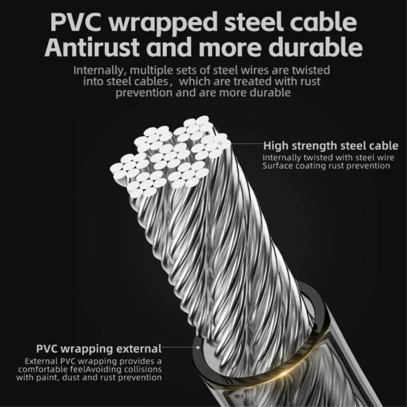 A proteção fiável dos seus bens contra o roubo é assegurada pela conceção multimaterial deste dispositivo antirroubo. Combina uma cabeça de bloqueio em liga de zinco moldada com precisão com um cabo interior em aço de alta resistência, proporcionando uma estrutura sólida. O invólucro exterior em composto de PVC oferece uma proteção eficaz contra a chuva e a corrosão, enquanto o invólucro em plástico ABS é resistente aos choques. O seu peso leve de 313 g facilita o transporte. Com um comprimento total de 115 cm, é ideal para prender bicicletas, trotinetas eléctricas ou portas de vidro a objectos fixos.