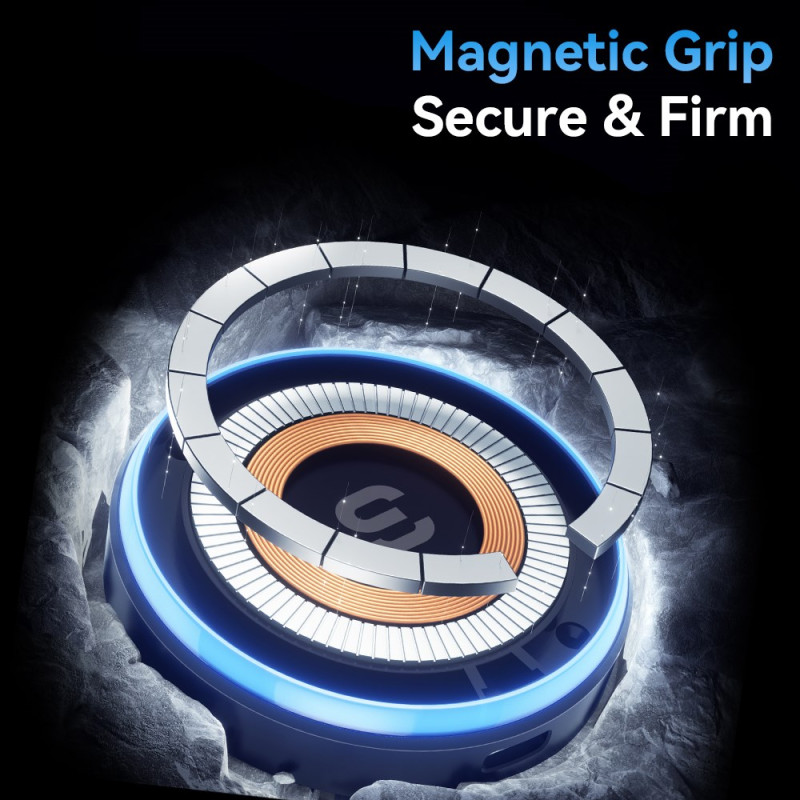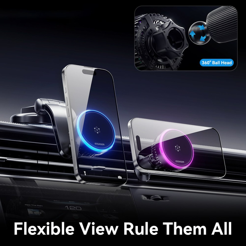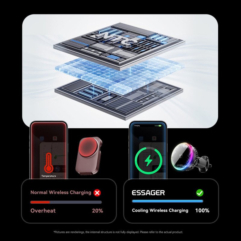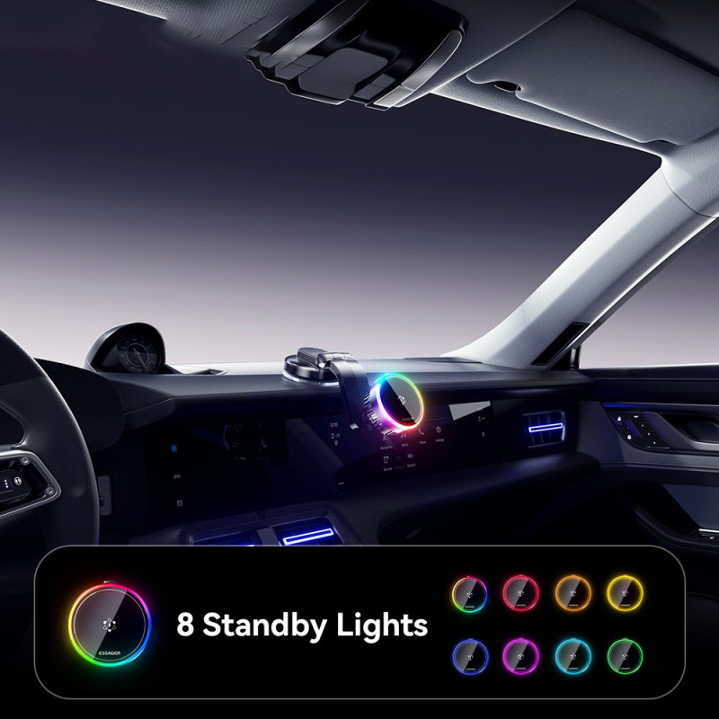 Carregador magnético sem fios inovador de 15 W com sistema de arrefecimento TEC avançado e ventoinha de alta velocidade. Fácil instalação na grelha de ventilação, rotação de 360° para um posicionamento ótimo. Carregamento rápido e seguro com indicador LED.