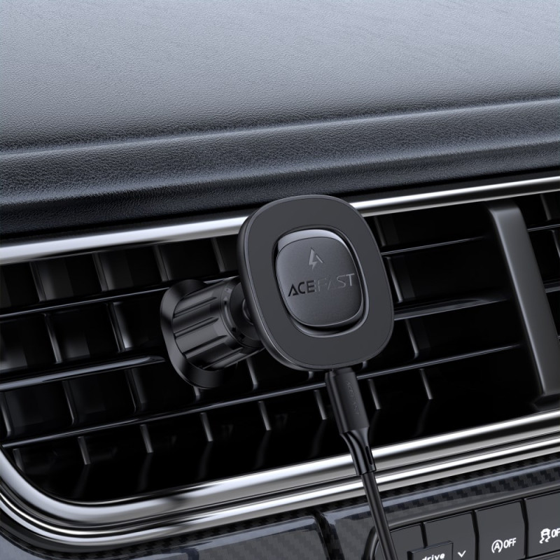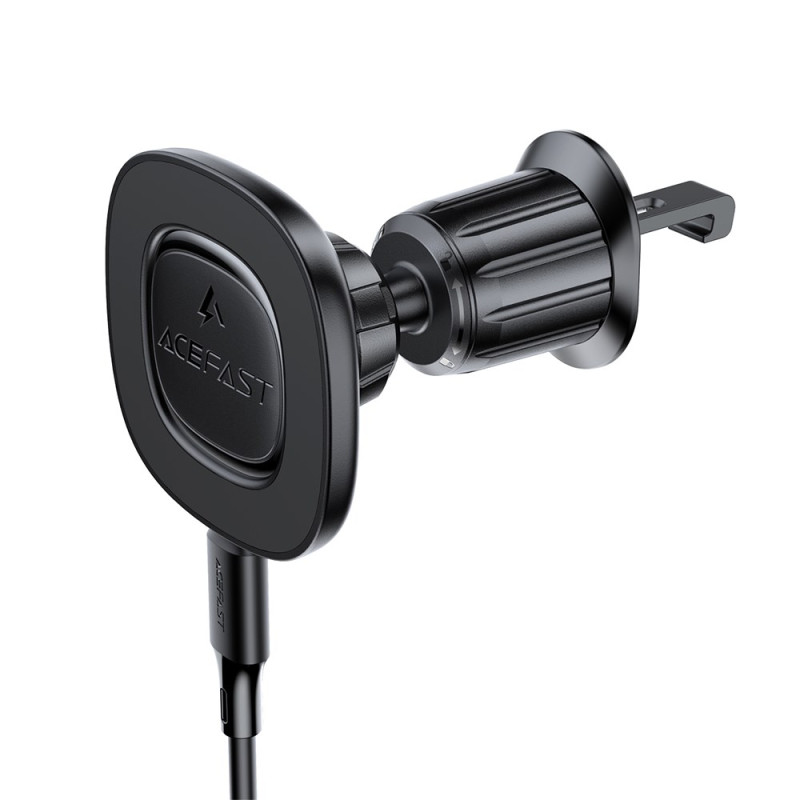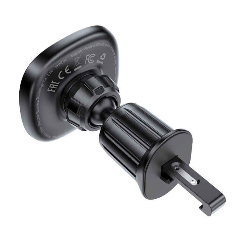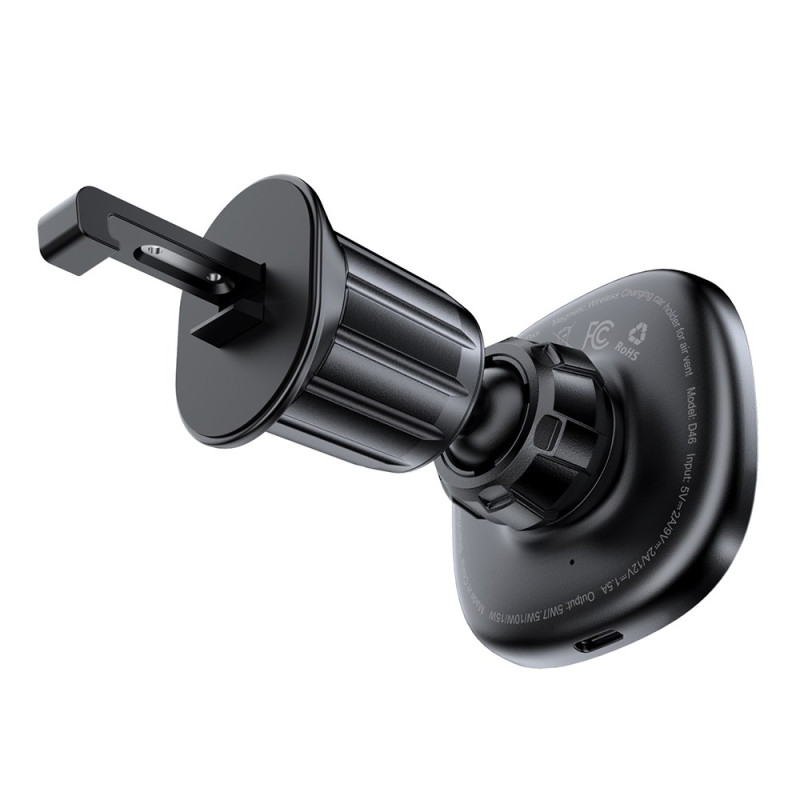 Carregador magnético sem fios para automóvel com carregamento rápido até 15 W. Fixa-se firmemente à saída de ar com uma superfície de silicone antiderrapante. Compatível com smartphones de 4,7 a 6,9 polegadas. Design elegante e minimalista.