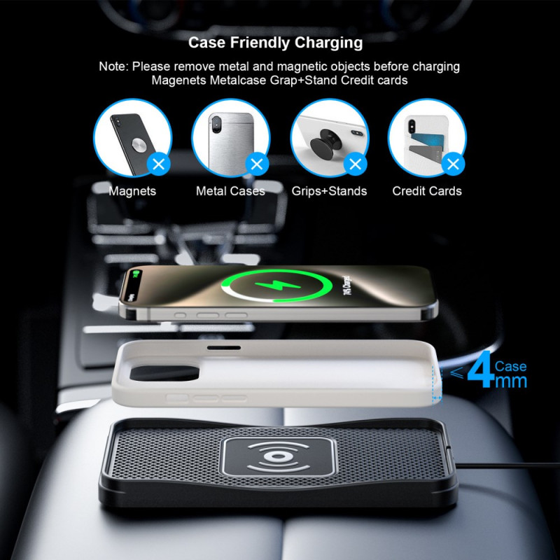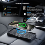 Carregador sem fios para automóvel com carregamento rápido até 20 W. Inclui uma almofada de silicone antiderrapante para manter o telemóvel seguro durante a condução. Fácil de instalar sem modificar o veículo, com cabo de 1 metro.