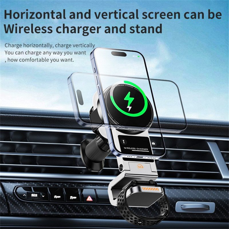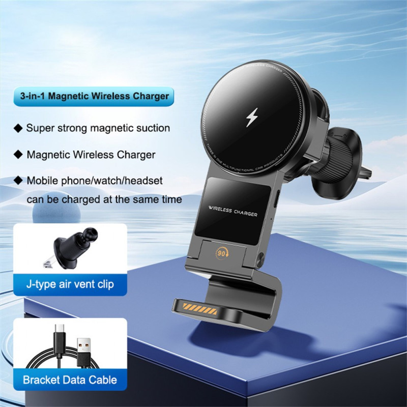 Transforme a sua viagem com este inovador suporte magnético que carrega simultaneamente o telemóvel, o relógio e os auscultadores. Desfrute de um carregamento rápido de 15 W e de uma instalação segura numa grelha de ventilação para uma condução conectada.