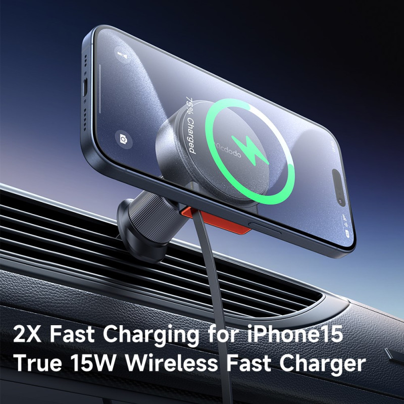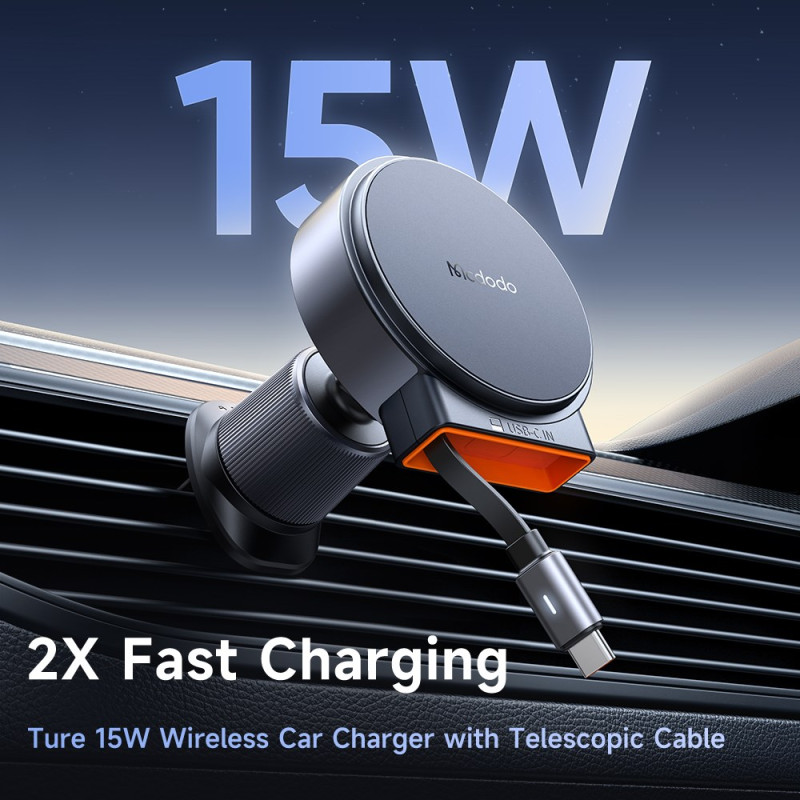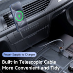 Carregador magnético sem fios de 15 W com cabo USB-C retrátil de 1 m incorporado. Compatível com iPhone 12-15 e Samsung. Bobina magnética dupla para fixação estável nas saídas de ar. Carregamento rápido de 15 W com proteção total e certificações CE, FCC e outras...