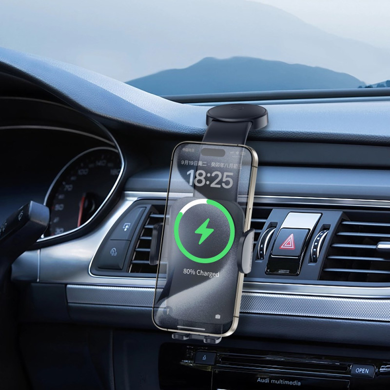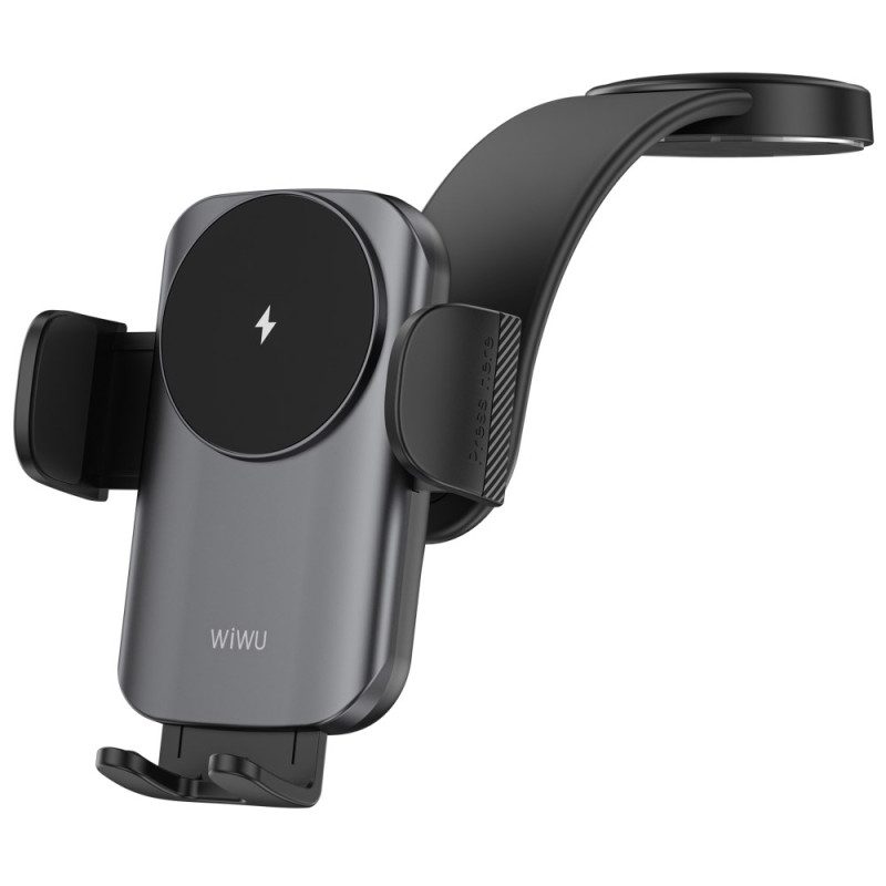Descubra o suporte para automóvel WIWU CH-322: um carregador sem fios ultrarrápido de 15 W com fixação automática inteligente. Basta colocar o telemóvel e deixar que os braços se fechem automaticamente para uma fixação segura. A sua base adesiva resistente adapta-se a todos os painéis de instrumentos lisos. O design ergonómico não obstrui a vista nem a porta de carregamento do telefone.