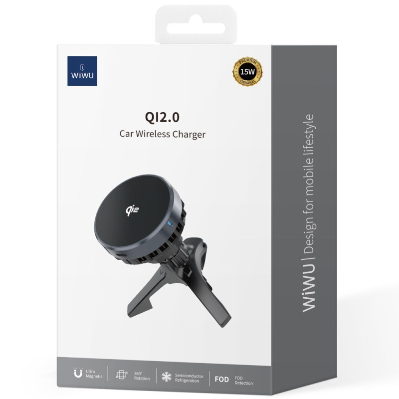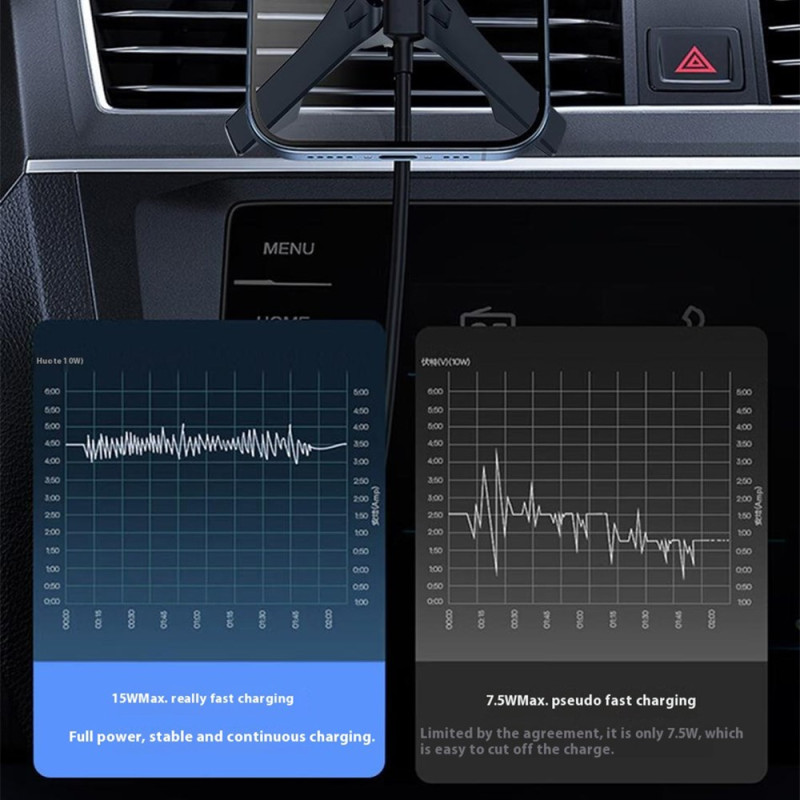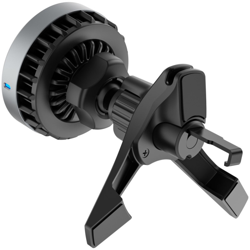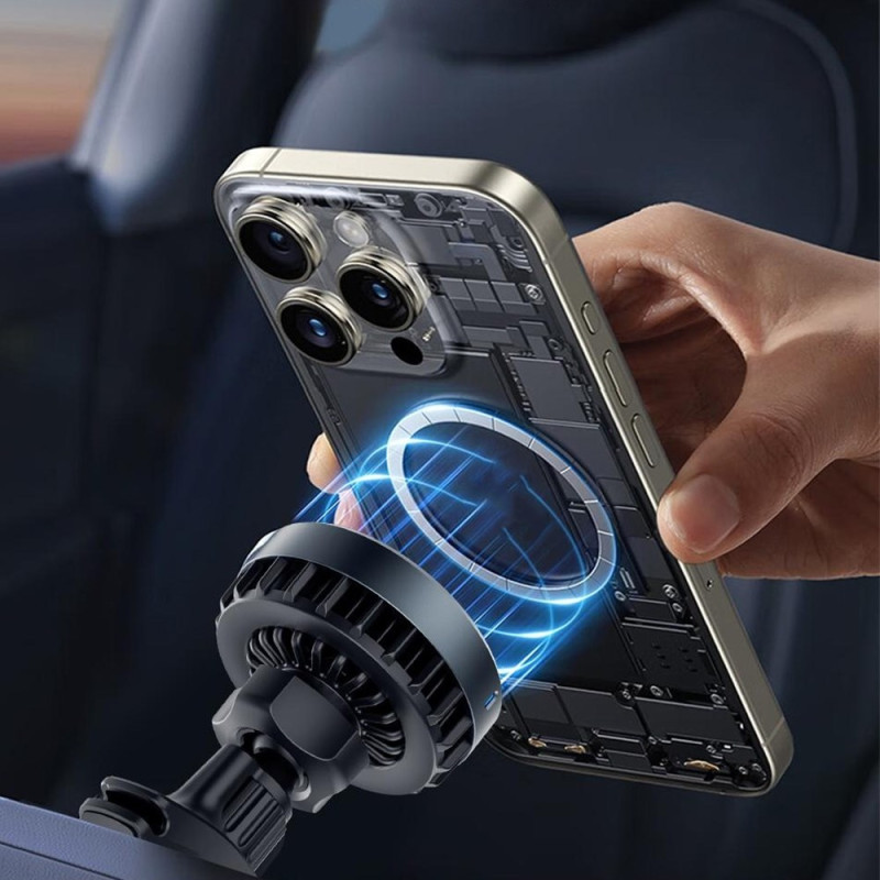 Suporte inovador 2 em 1 que combina um carregador magnético sem fios de 15 W e um suporte para telemóvel com uma grelha de ventilação. Com um sistema de arrefecimento avançado com ventoinha turbo e dissipador de calor, mantém o telemóvel fresco durante o carregamento rápido. Instalação fácil com uma só mão para uma navegação GPS e chamadas seguras.
