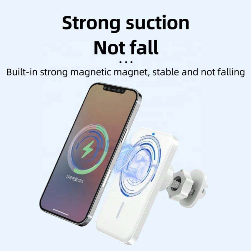 Suporte magnético 2 em 1 para automóvel com carregador rápido sem fios até 15 W. Fixa-se firmemente à saída de ar e roda 360° para um ângulo de visualização ótimo. Ideal para navegação GPS e chamadas durante a condução.