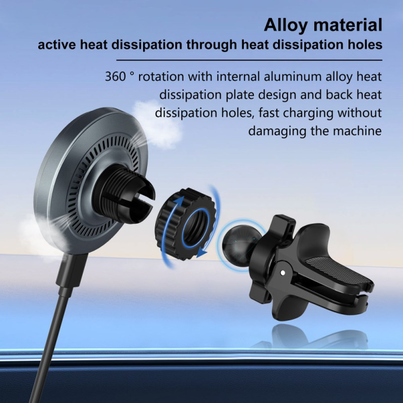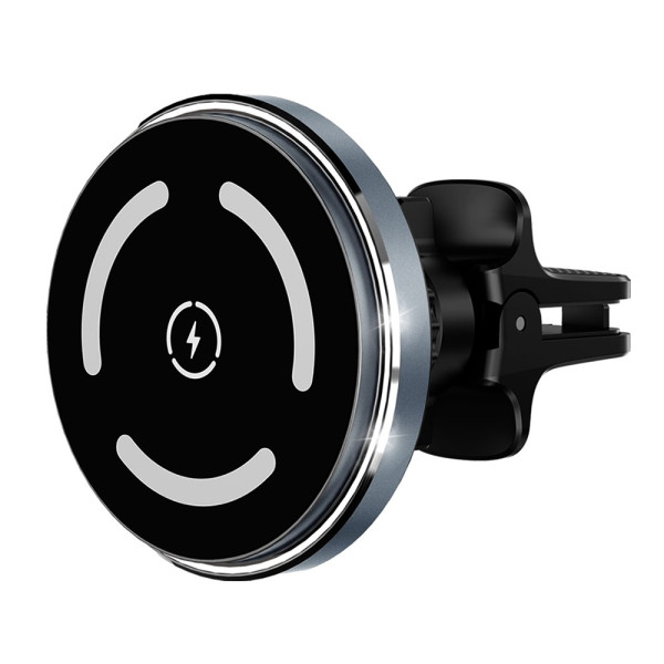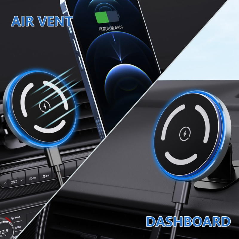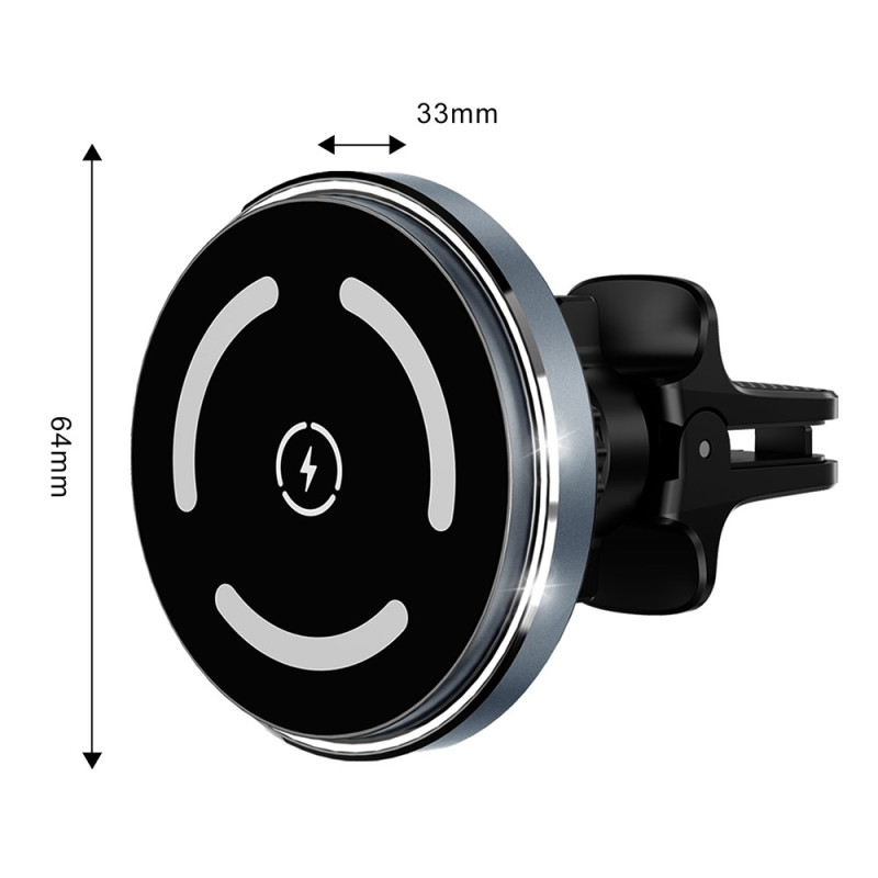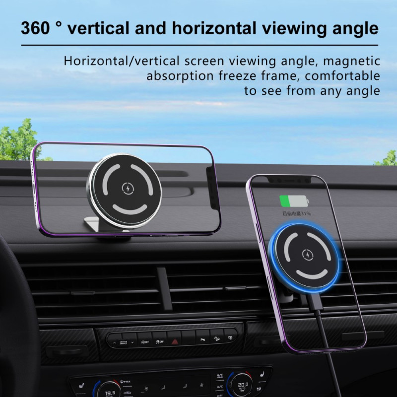 Transforme o seu automóvel com este elegante carregador magnético sem fios de 15 W. Design ultrafino com rotação de 360°, iluminação LED ambiente e ímanes reforçados para uma fixação ultra-estável. Compatível com todos os smartphones carregáveis sem fios.