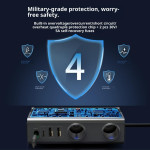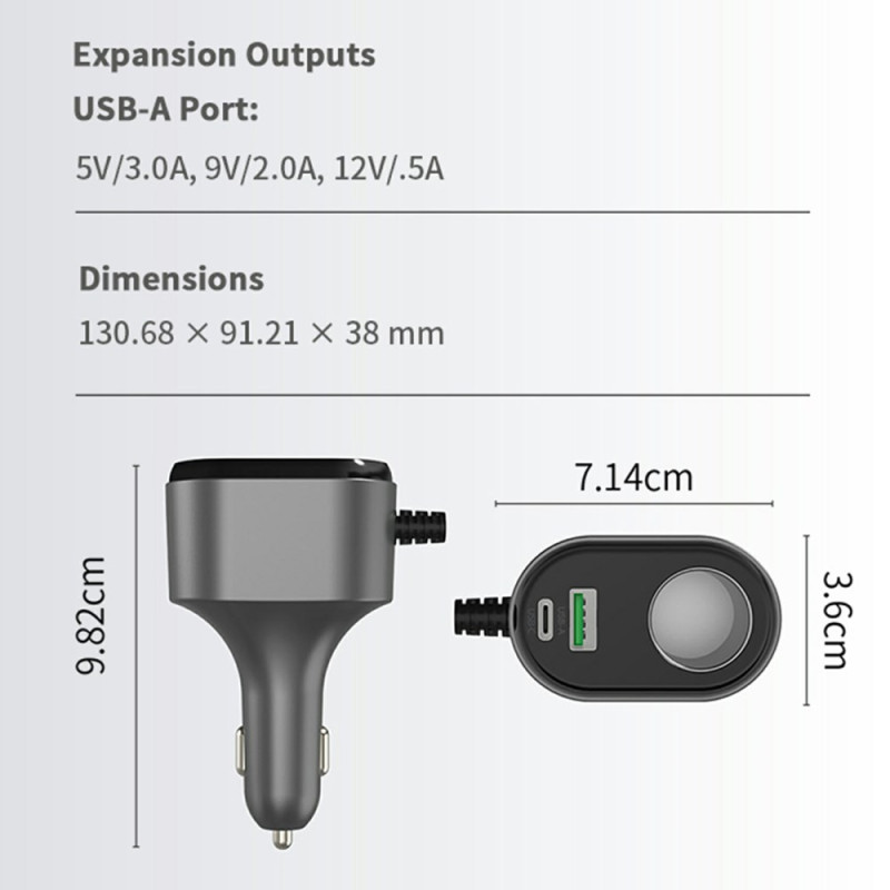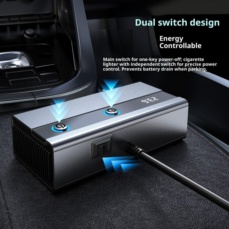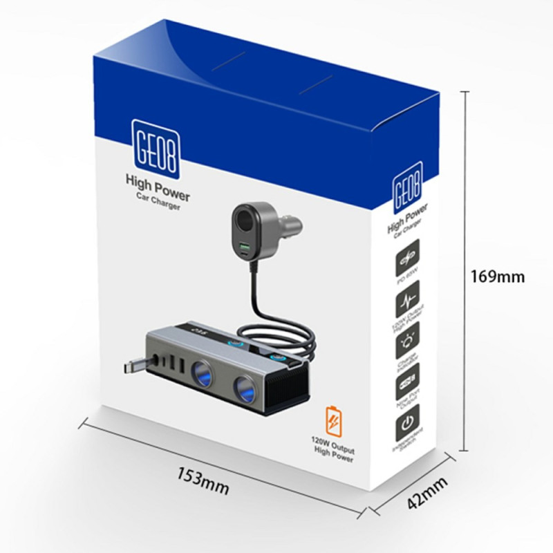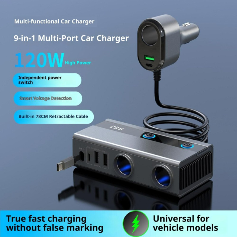 Carregador multiporta 9 em 1 de 120 W para automóvel com cabo retrátil de 78 cm e carregamento rápido PD de 65 W. Interruptores duplos para um controlo preciso da potência. Compatível com todos os veículos de 12V-24V.