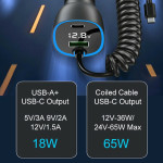 Chargeur voiture intelligent GE05 offrant une charge rapide PD 65W avec câble Type-C rétractable intégré. Équipé d'un écran affichant la tension en temps réel et de deux ports (USB-C 65W + USB-A 18W) pour recharger plusieurs appareils simultanément...