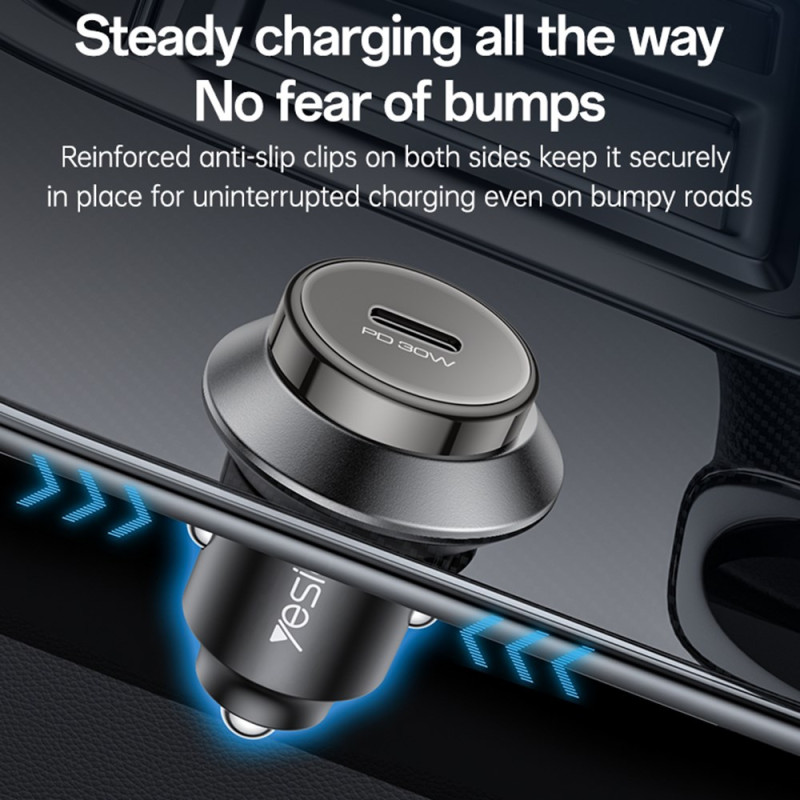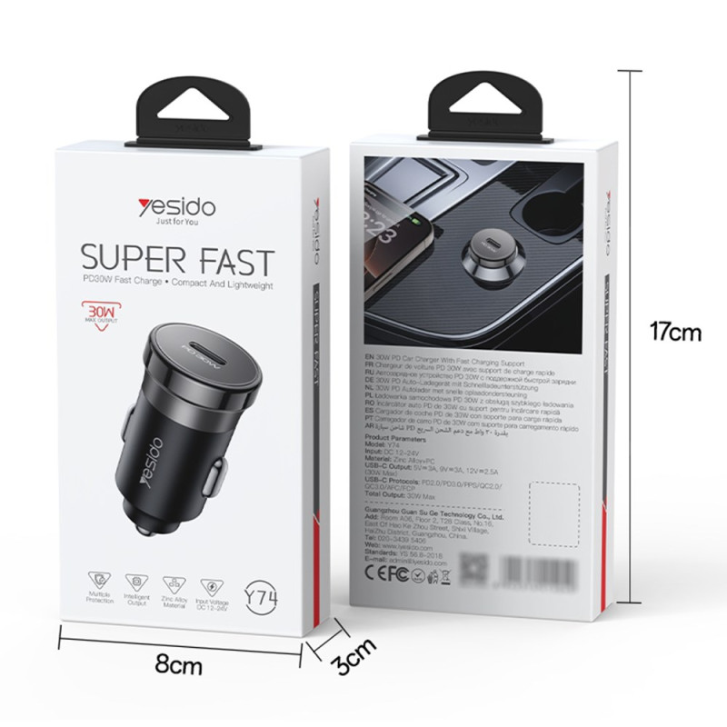Descubra o carregamento ultrarrápido de 30 W com o YESIDO Y74. Compatível com todos os seus dispositivos graças aos protocolos PD3.0, PPS e QC3.0. Design compacto e elegante, perfeito para quando está em movimento. Construção robusta para uma durabilidade máxima Adequado para todos os veículos com entrada 12-24V.