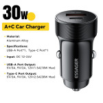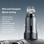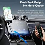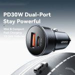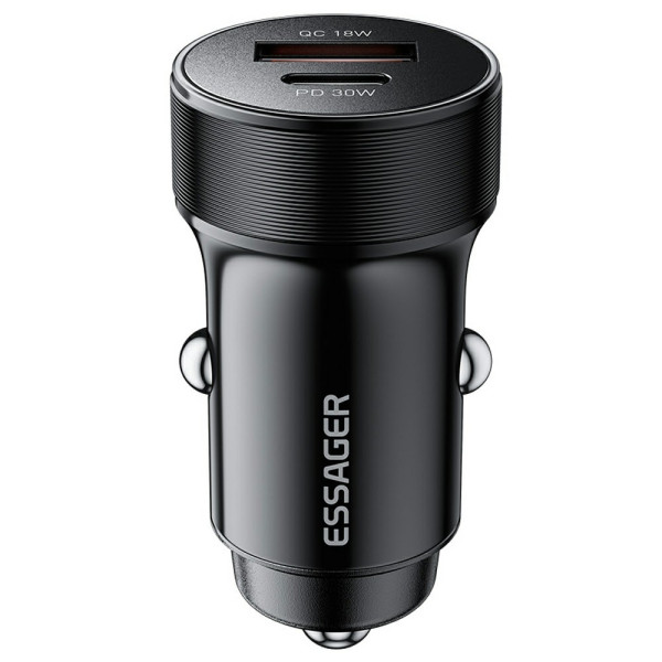 Carregador para automóvel ESSAGER com tecnologia PD 30W para um carregamento ultrarrápido. Duas portas USB-A e Type-C com chip inteligente para uma distribuição óptima da energia. Compatível com todos os seus dispositivos.