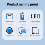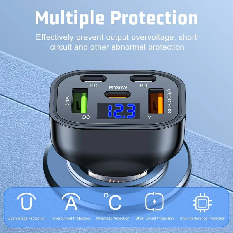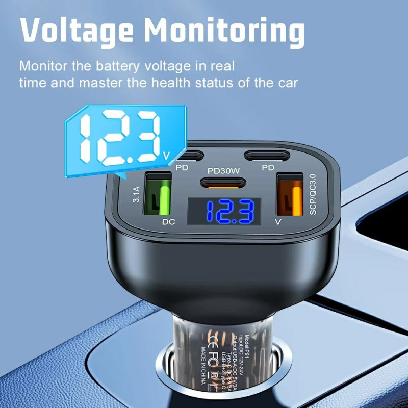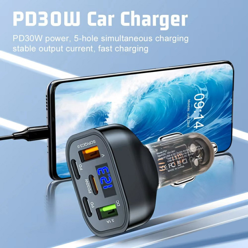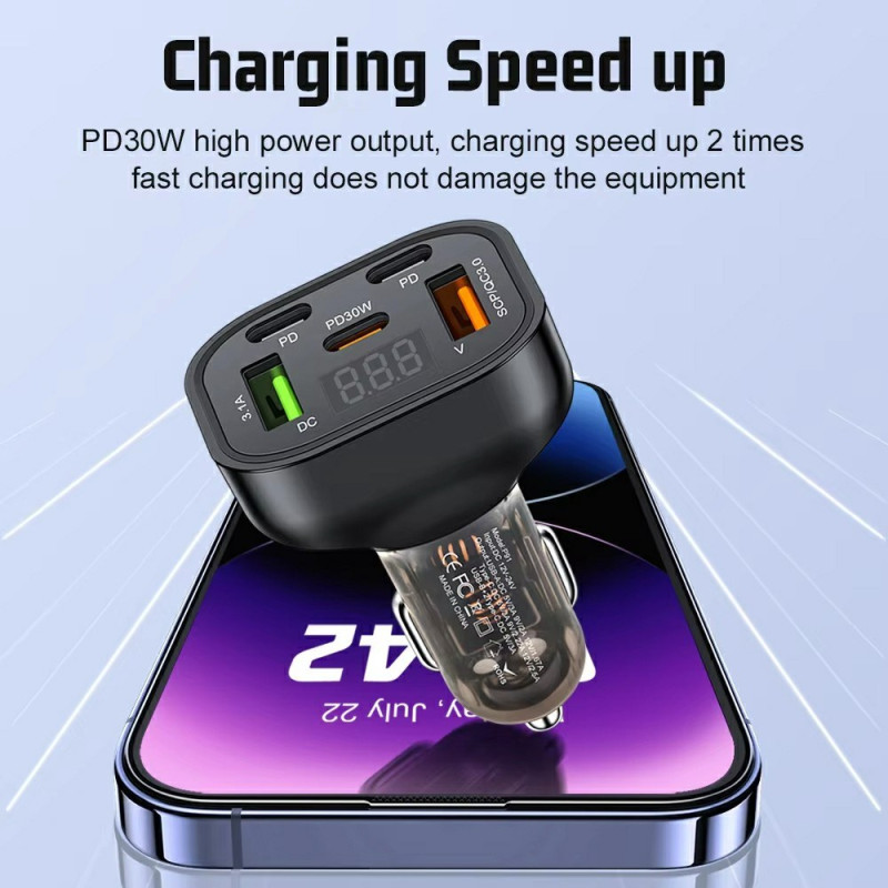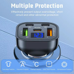 Carregador para automóvel de 150 W de alto desempenho com 5 portas (3 Type-C + 2 USB) e tecnologia de carregamento rápido QC3.0 PD. Com um chip dual-core inteligente e um ecrã de tensão em tempo real para um carregamento ideal de todos os seus dispositivos.