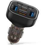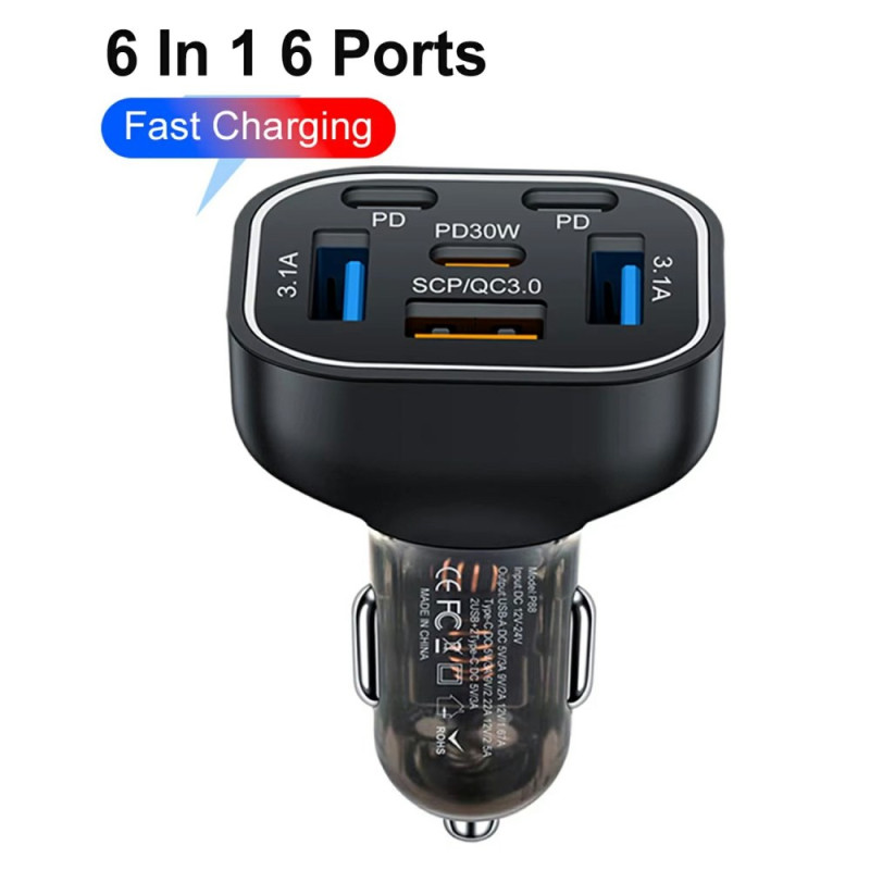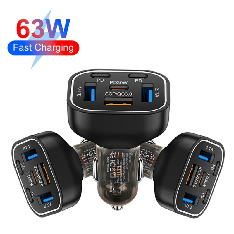 Carregue até 6 dispositivos em simultâneo com este carregador para automóvel compacto de 63 W. Com 3 portas USB e 3 portas PD Type-C, oferece um carregamento rápido e eficiente, ao mesmo tempo que protege os seus dispositivos. O seu design elegante com LED de 7 cores dá-lhe um toque único.