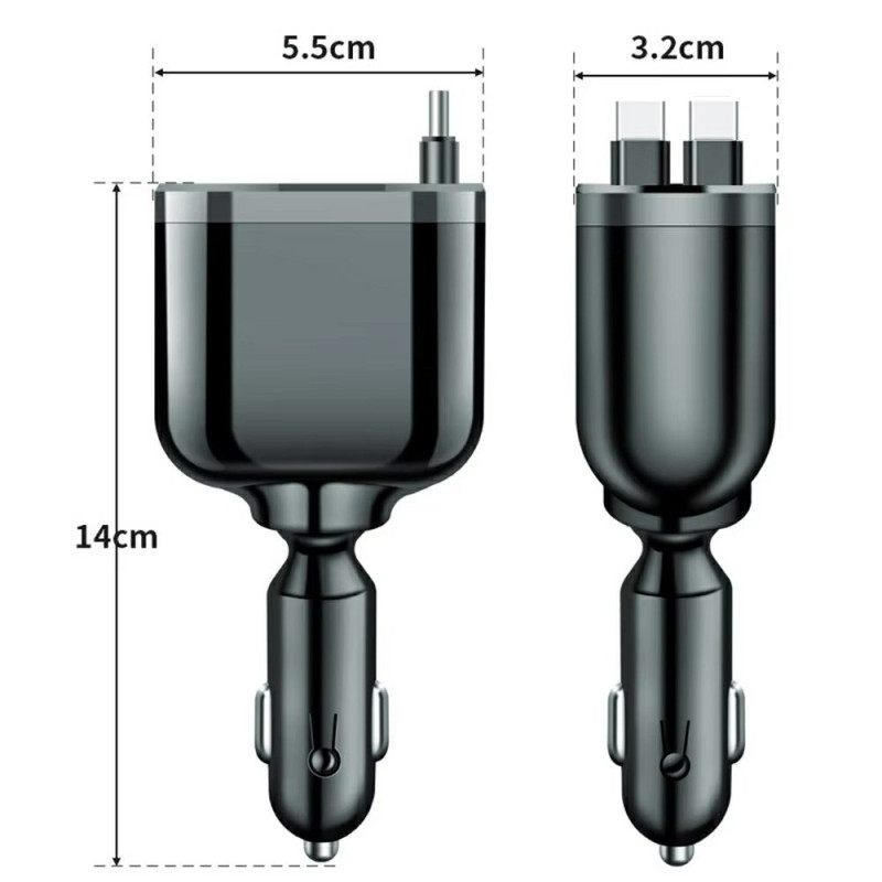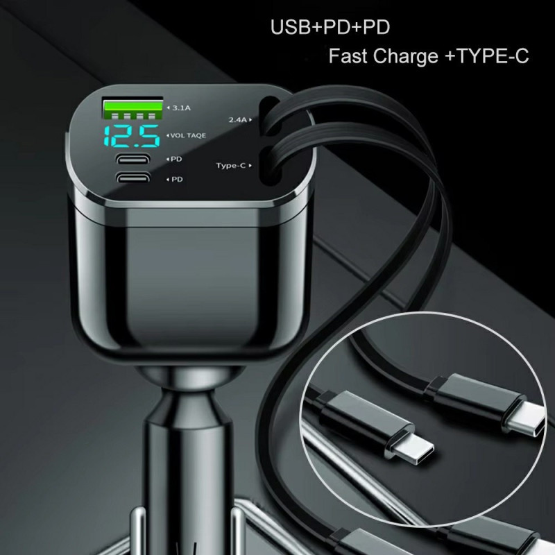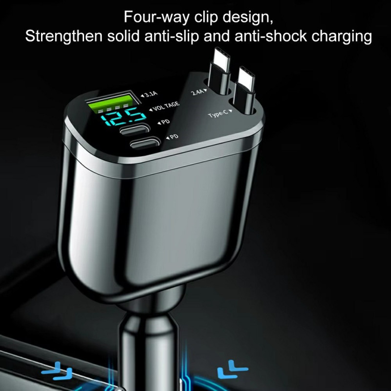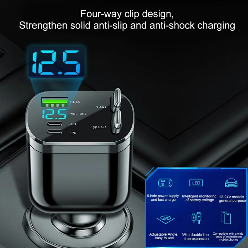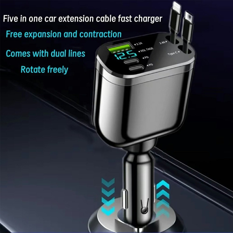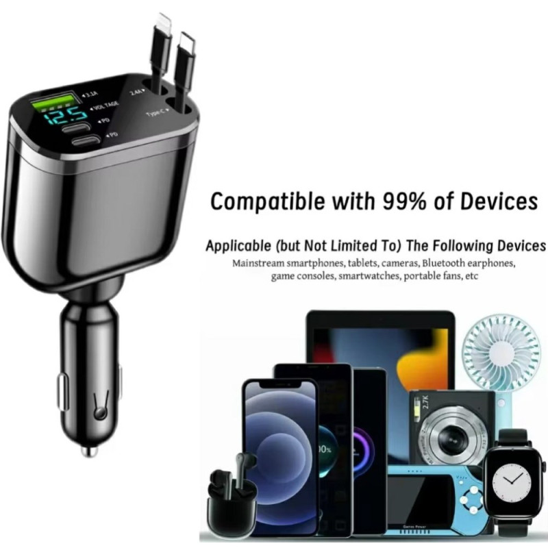 Carregue até 5 dispositivos em simultâneo com este carregador para automóvel inteligente. Inclui tecnologia de carregamento rápido PD, ecrã LED digital e 2 práticos cabos retrácteis. Proteção multicamada integrada para uma segurança óptima.