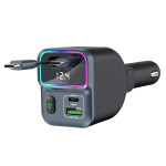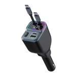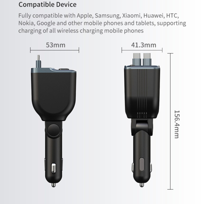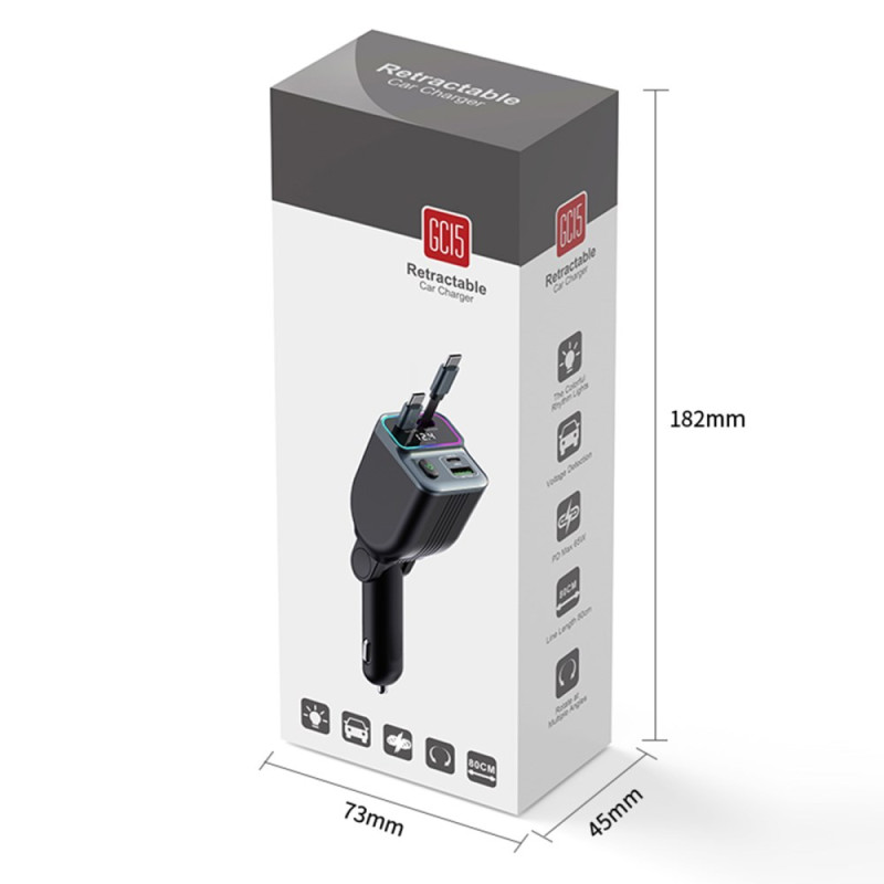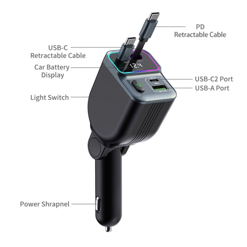 Carregador para automóvel de elevado desempenho com dois cabos USB-C retrácteis incorporados e monitor de tensão em tempo real. Potência combinada de 83 W para um carregamento rápido e simultâneo dos seus dispositivos. Compatível com todos os smartphones e veículos de 12V/24V.