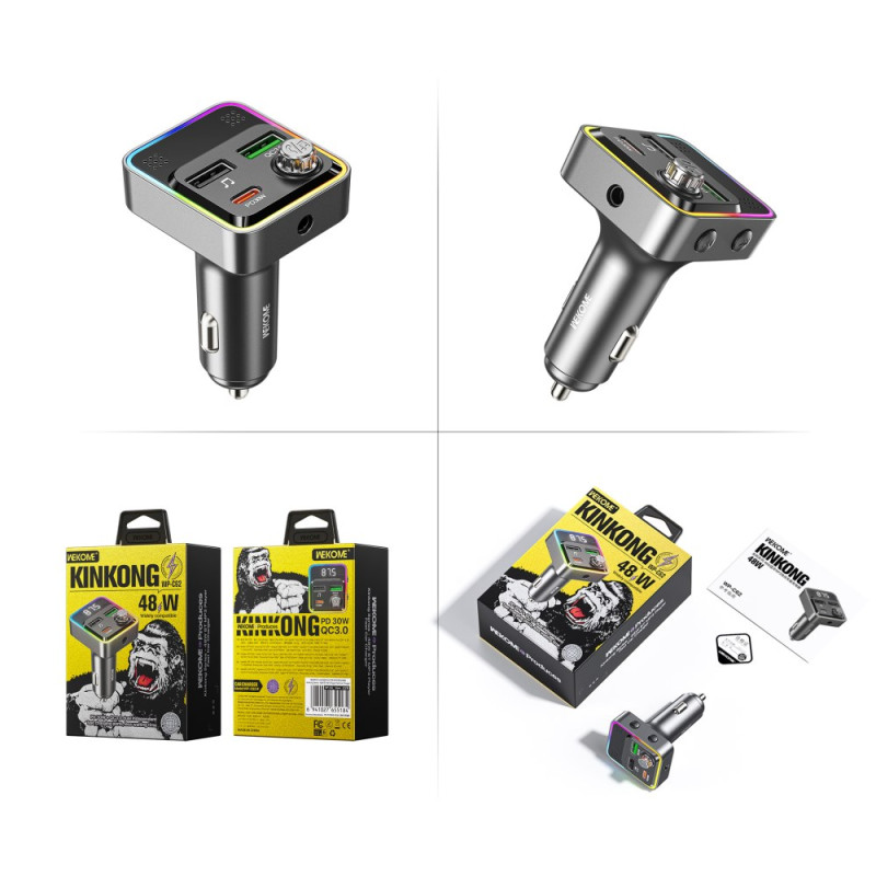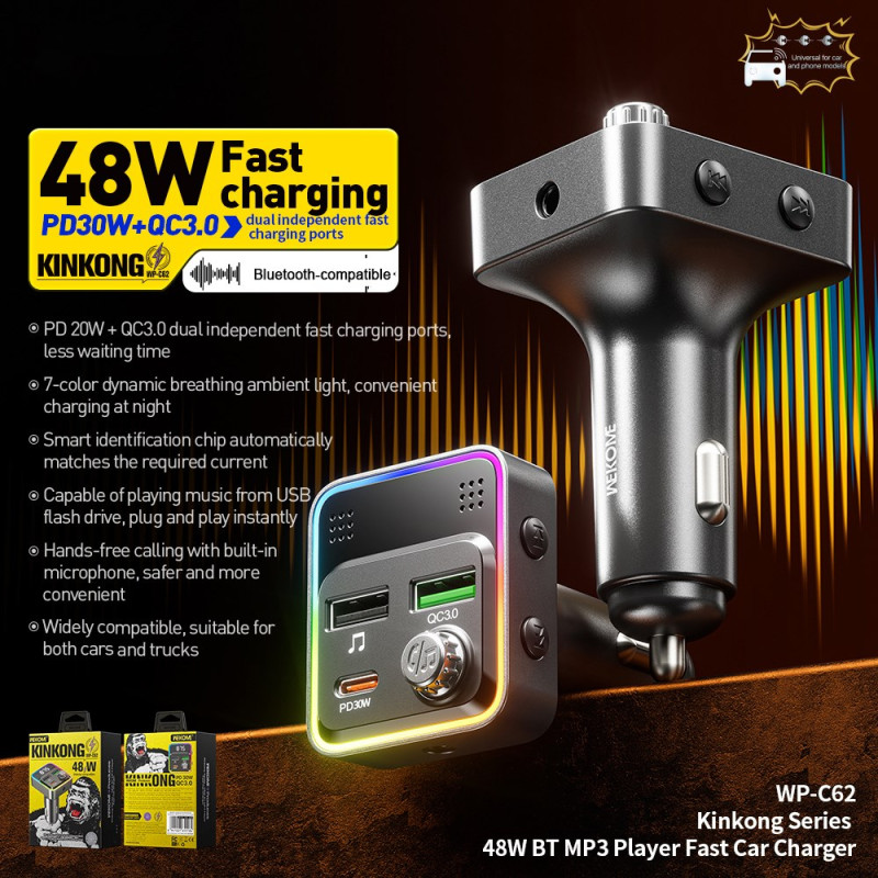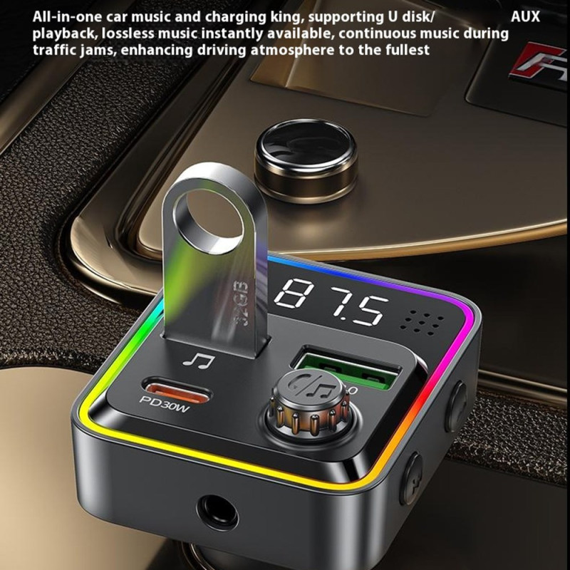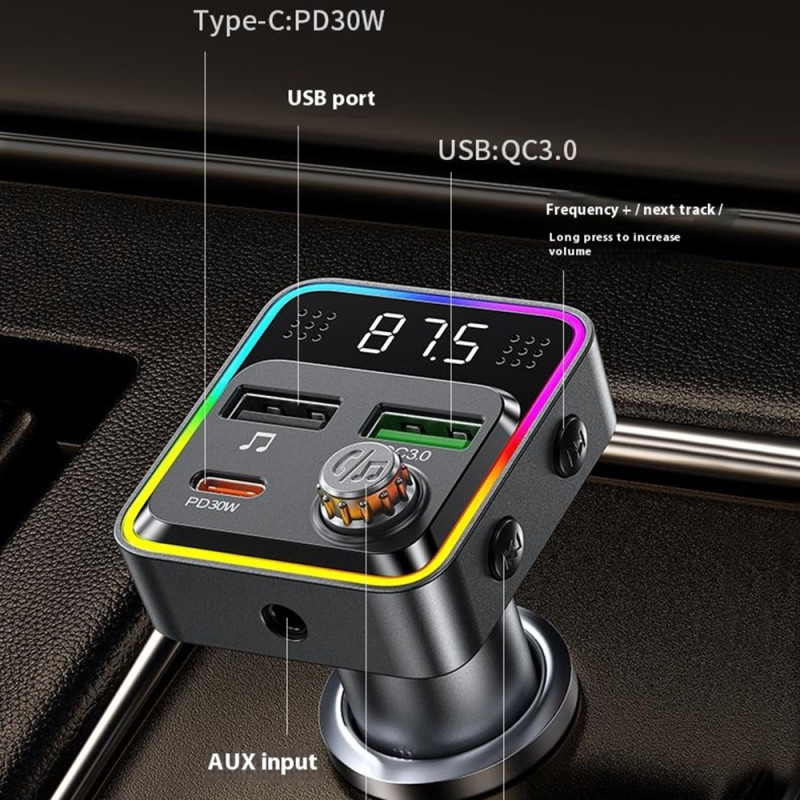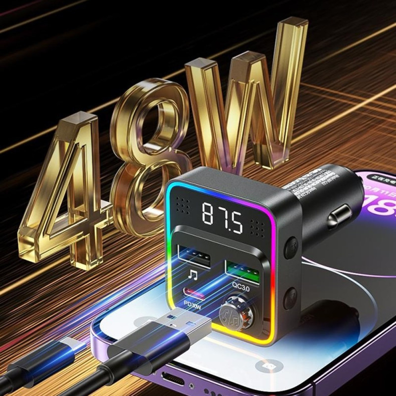 Carregador de automóvel inteligente de 48 W com duas portas de carregamento rápido (PD30W + QC3.0), leitor de MP3 integrado e iluminação ambiente de 7 cores. Desfrute de chamadas Bluetooth em modo mãos-livres e de um carregamento ótimo para todos os seus dispositivos. Compatível com 12V-24V.