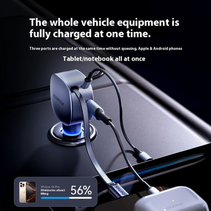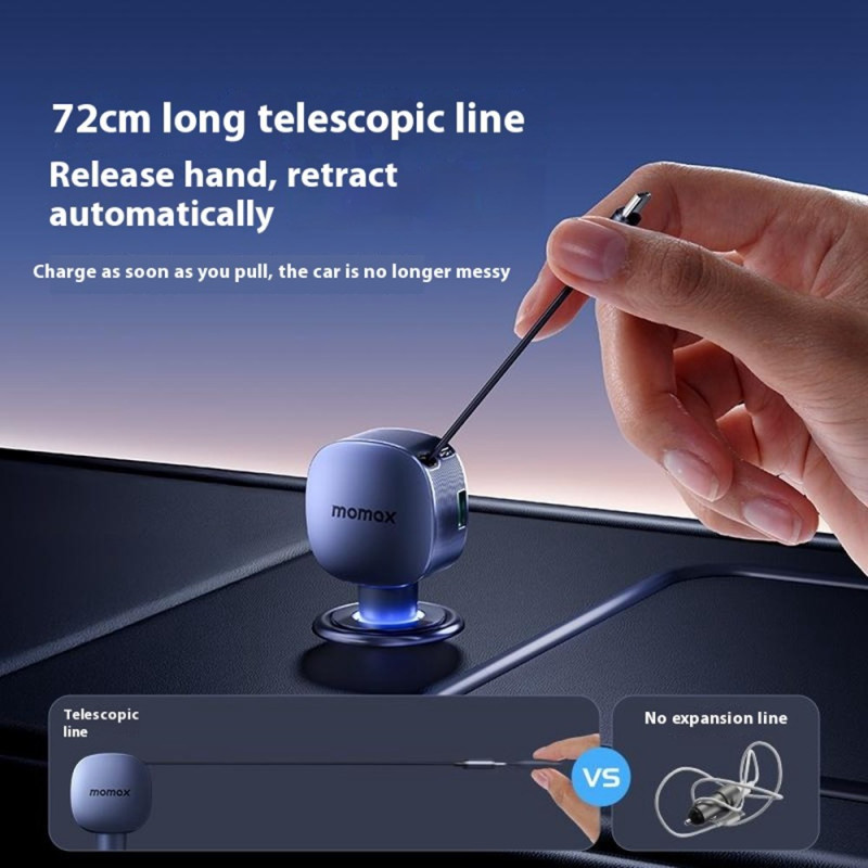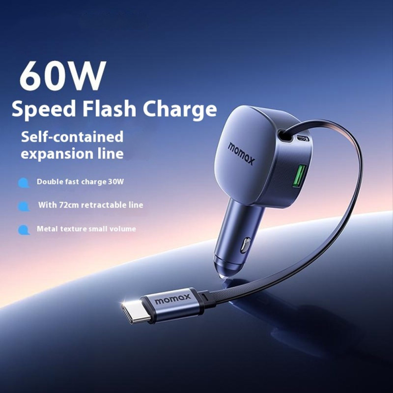 Carregador para automóvel de 60 W com cabo retrátil de 72 cm integrado. Carregamento rápido simultâneo para até 3 dispositivos (smartphones, tablets, computadores portáteis). Compatível com PD/QC/PPS e 90% dos veículos de 12-24V. Proteção inteligente contra sobretensão.