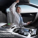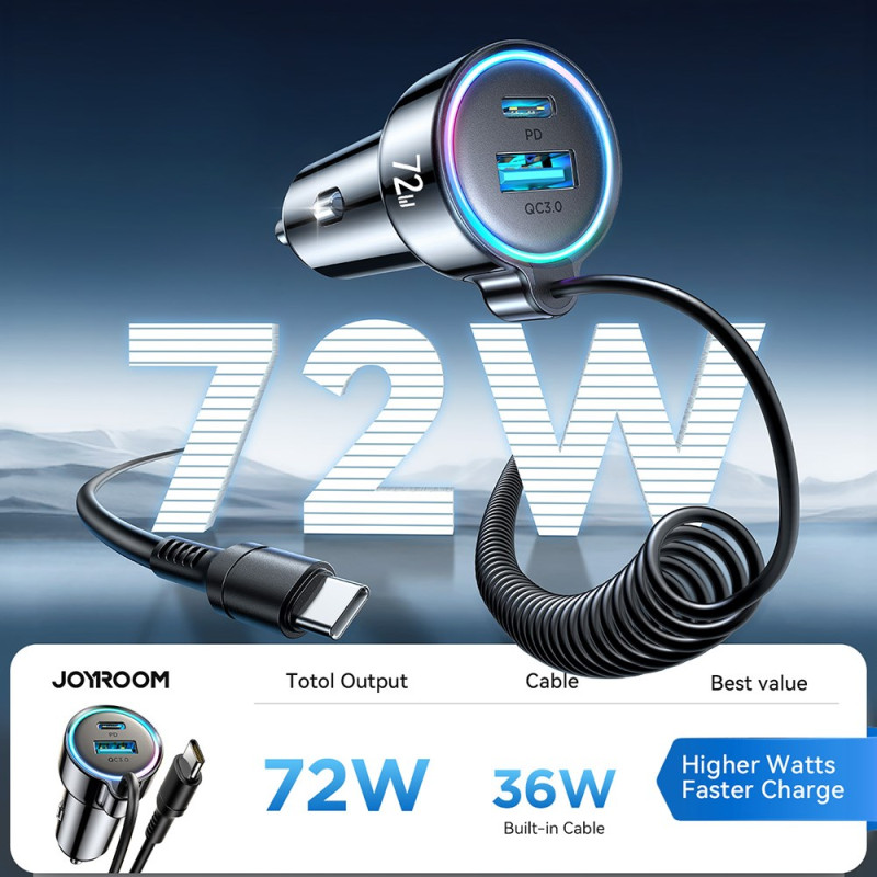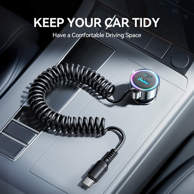 Carregue até três dispositivos em simultâneo com o nosso carregador para automóvel ultrarrápido de 72 W. Com um cabo de mola que pode ser estendido até 1,6 m e iluminação ambiente de 7 cores, oferece um carregamento seguro e cómodo para todos os seus dispositivos.