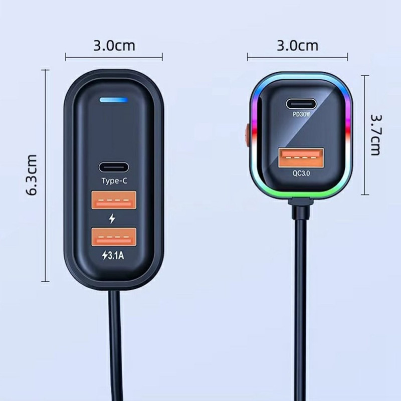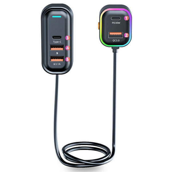 Transforme o seu automóvel numa estação de carregamento versátil! Este carregador multiportas oferece um carregamento rápido de 30 W PD e QC 3.0 para todos os seus dispositivos. Com o seu cabo de extensão de 1 m e a elegante iluminação ambiente, pode carregar até 5 dispositivos simultaneamente a partir dos bancos dianteiros e traseiros.