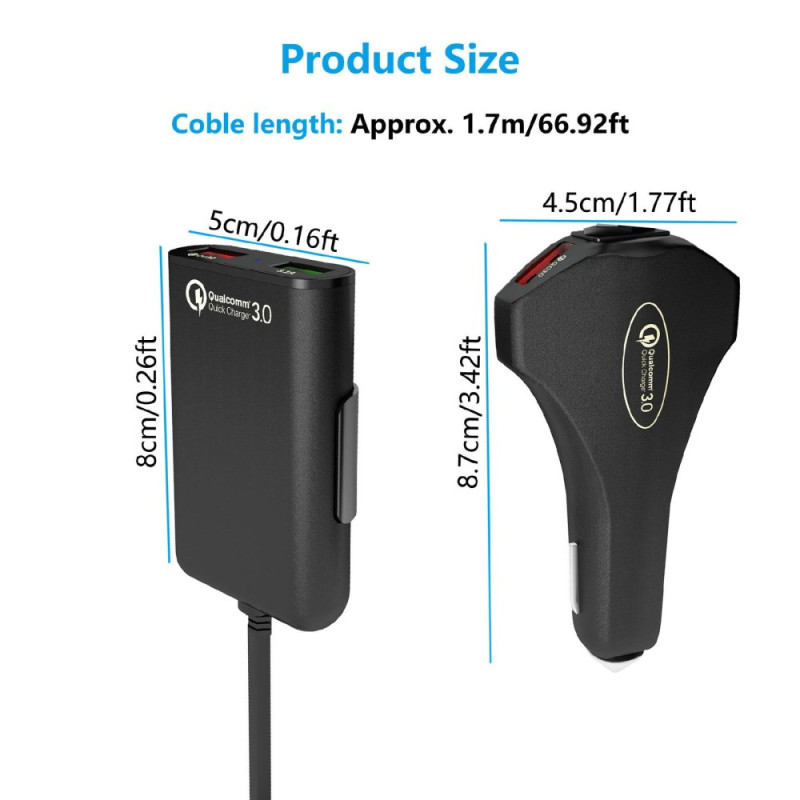 Carregador para automóvel de elevado desempenho com tecnologia Qualcomm Quick Charge 3.0 e 4 portas USB. Carrega até 4 dispositivos em simultâneo a uma velocidade 4 vezes superior à dos carregadores normais. Cabo extra-longo de 1,7 m incluído para facilitar o acesso dos passageiros dos bancos traseiros.