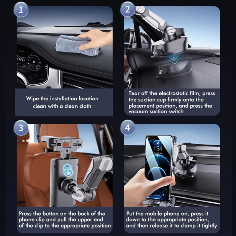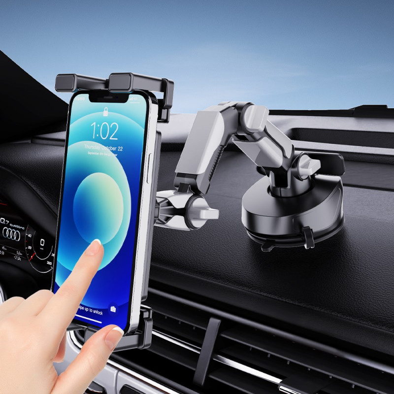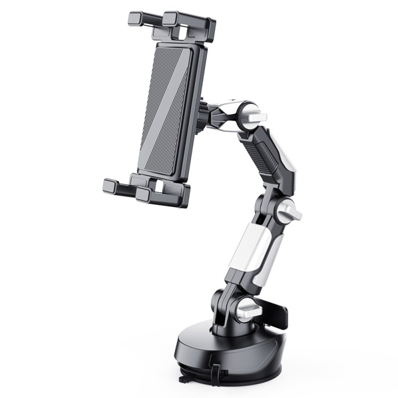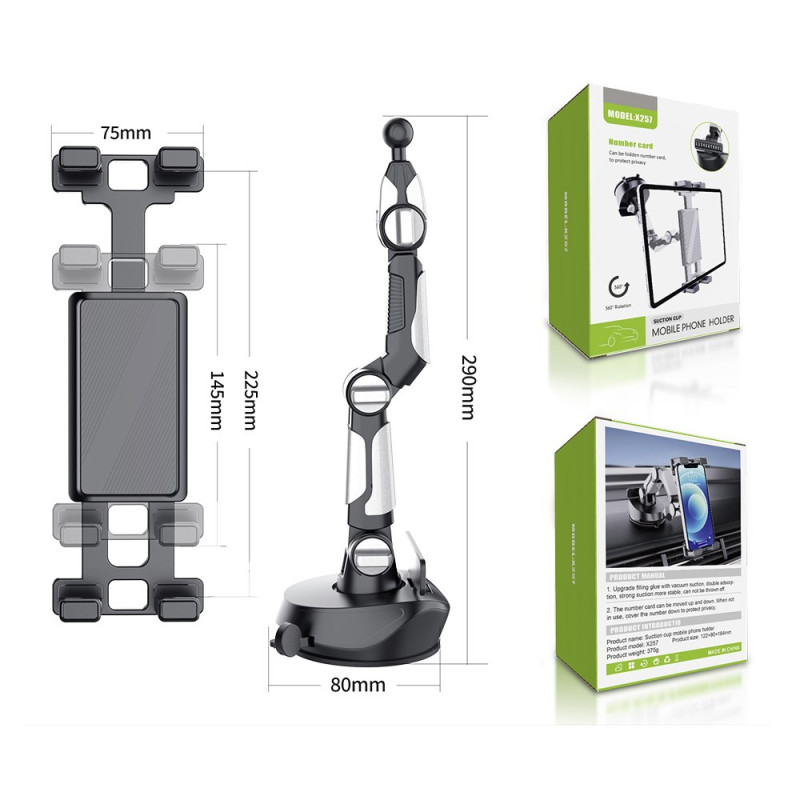 Suporte universal X257 com ventosa potente e braço articulado para telemóveis e tablets. Rotação de 360° para uma utilização óptima em modo retrato ou paisagem. Compatível com dispositivos de 145-225 mm. Ideal para navegação GPS, chamadas em modo mãos-livres e entretenimento seguro em movimento.
