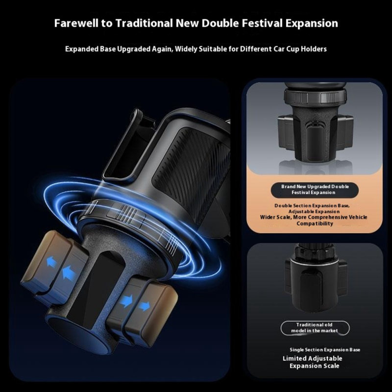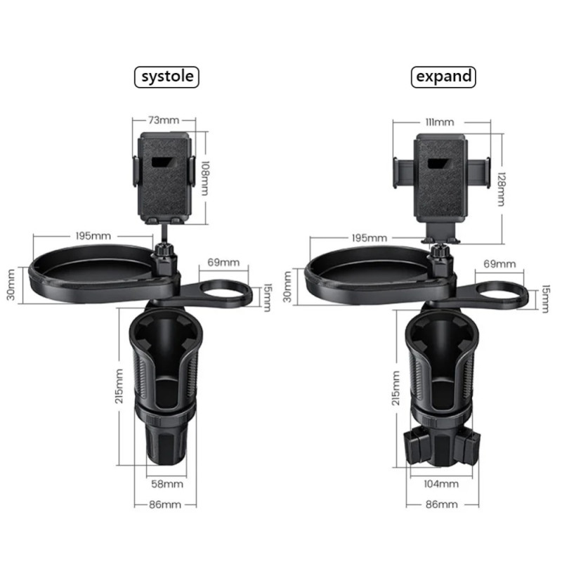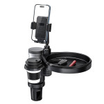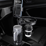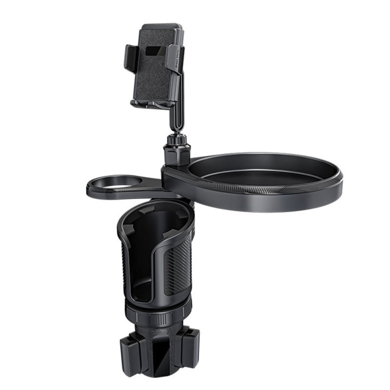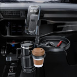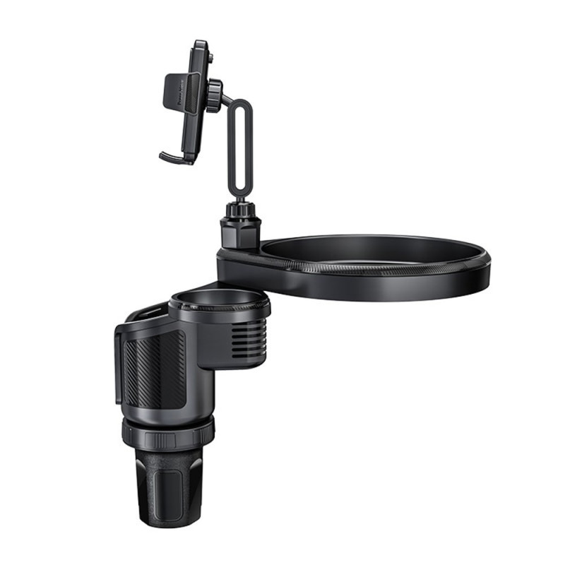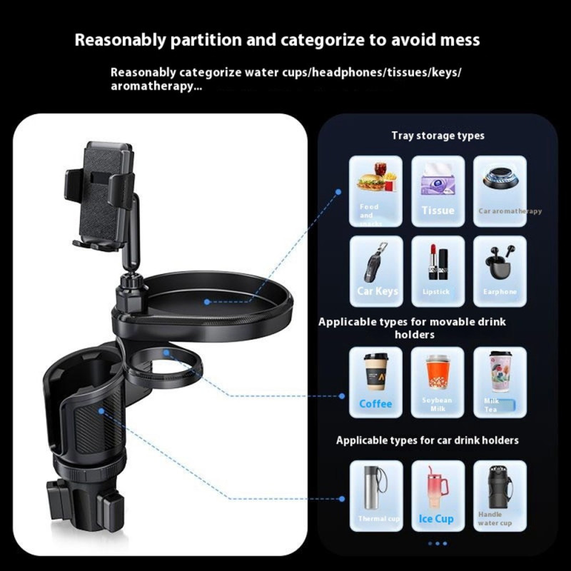 Transforme o seu suporte para copos numa estação multifunções! Este suporte universal 4 em 1 combina um suporte para telemóvel com rotação de 360°, um tabuleiro de arrumação e dois suportes para copos. Instalação fácil com uma simples torção, compatível com a maioria dos veículos.