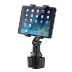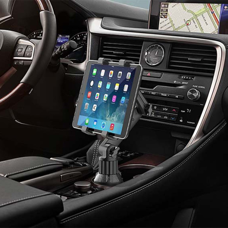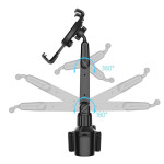Suporte universal para tablet para porta-copos de automóvel com pescoço longo ajustável e rotação de 360°. Base robusta e estável, fácil instalação sem adesivo. Compatível com dispositivos de 12,5 a 20 cm. Perfeito para navegação GPS.