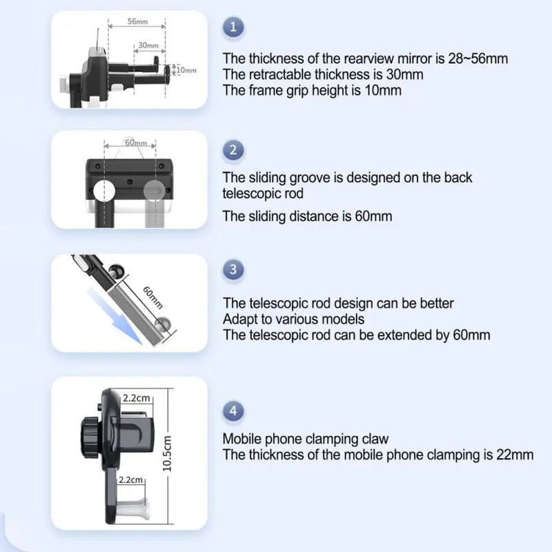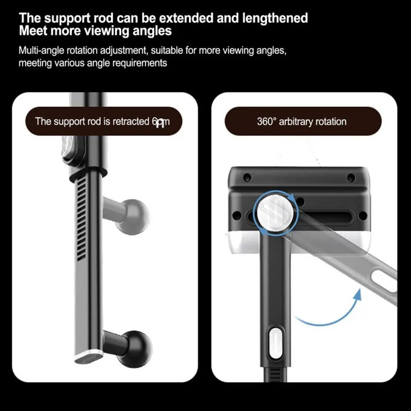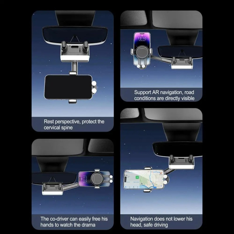 O suporte para telemóvel para espelho retrovisor H256 oferece uma solução prática e segura para manter o seu smartphone ao alcance da mão enquanto conduz. O braço telescópico ajustável e a rotação de 360° permitem-lhe definir o ângulo perfeito para a navegação, sem obstruir a visão. Concebido com uma braçadeira antirreflexo e um revestimento de silicone, protege o espelho e proporciona uma fixação firme e estável. Leve e fácil de instalar graças ao seu cabo de aço, adapta-se à maioria dos espelhos retrovisores e mantém o telemóvel firmemente no lugar para uma condução mais suave e segura.
