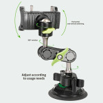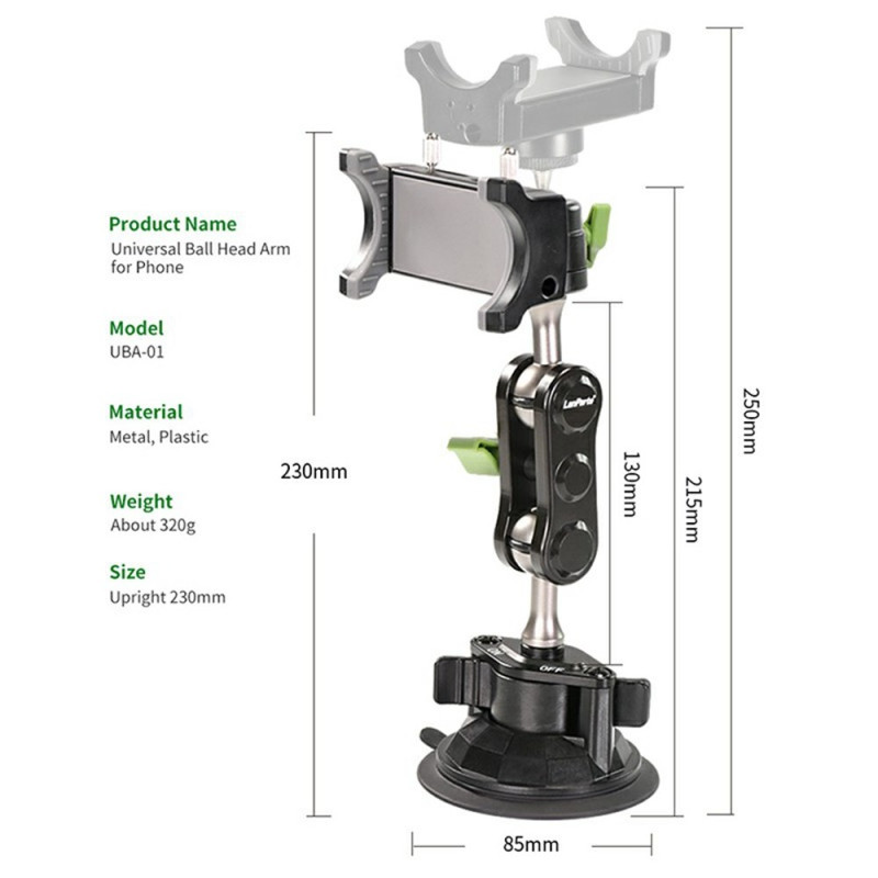 O suporte para automóvel com ventosa universal LANPARTE UBA-01 proporciona uma fixação estável e versátil para smartphones e pequenas câmaras. Graças à sua poderosa ventosa, adere firmemente ao painel de instrumentos ou ao para-brisas, garantindo uma estabilidade óptima durante a condução. O seu braço articulado permite vários ajustes para filmar ou navegar no ângulo perfeito. Fabricado em alumínio, ABS e silicone de alta qualidade, combina robustez e flexibilidade. Compatível com câmaras de 6,5 a 8 cm de largura e até 1 cm de espessura, pode ser utilizado tanto em viagens como em filmagens no exterior.