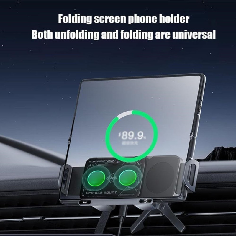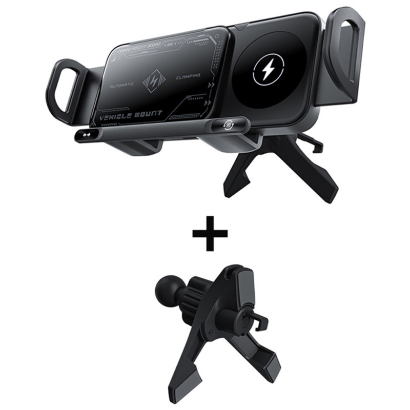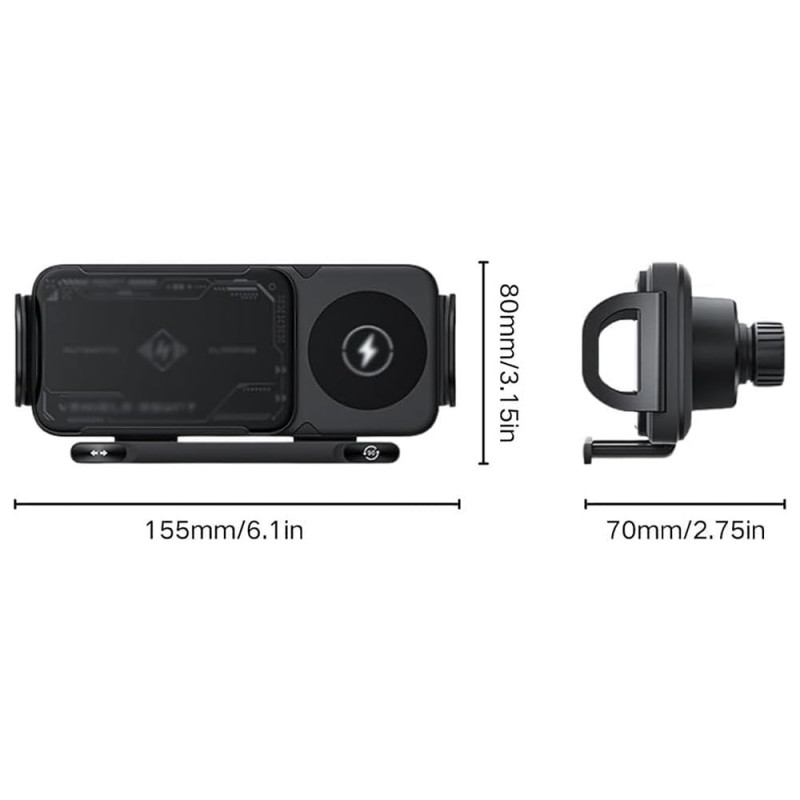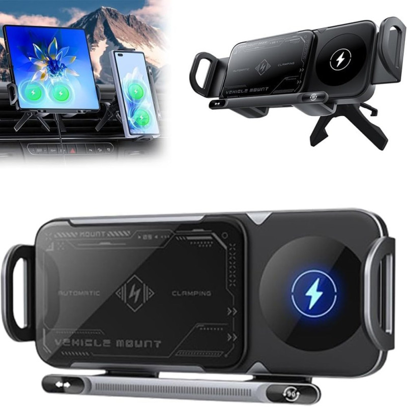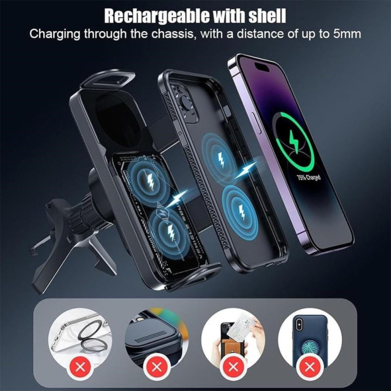 Este suporte de telemóvel para automóvel com carregador sem fios de 15 W combina conforto, potência e segurança para as suas viagens diárias. Graças à sua função de carregamento rápido, o seu telemóvel será totalmente autónomo sem necessidade de um cabo volumoso. O seu sistema auto-rotativo permite ajustar facilmente o telemóvel em modo retrato ou paisagem para uma navegação ideal. A fixação da grelha de ventilação garante uma estabilidade perfeita, mesmo em estradas irregulares. Concebido para acomodar uma vasta gama de telemóveis e tablets, oferece uma fixação firme e uma experiência de mãos livres ideal para conduzir com toda a tranquilidade.