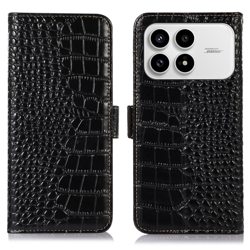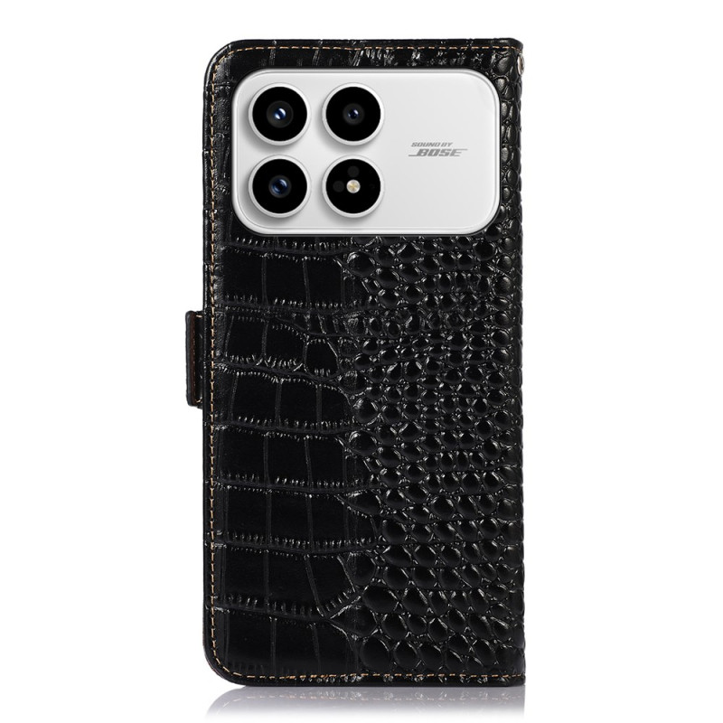 Descubra o nosso elegante capa de carteira em pele genuína com textura de crocodilo para o seu Poco F8 Pro. Com tecnologia de bloqueio RFID, 3 ranhuras para cartões e um suporte integrado, combina estilo e funcionalidade.