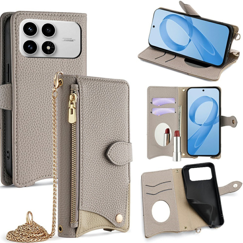 Descubra a nossa capa multifunções para carteira para o Xiaomi Poco F8 Pro. Com um design elegante e irregular em forma de rabo de peixe, combina proteção premium e praticidade com os seus compartimentos para cartões, espelho integrado e alça de ombro em corrente.