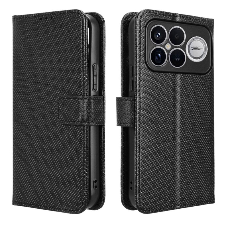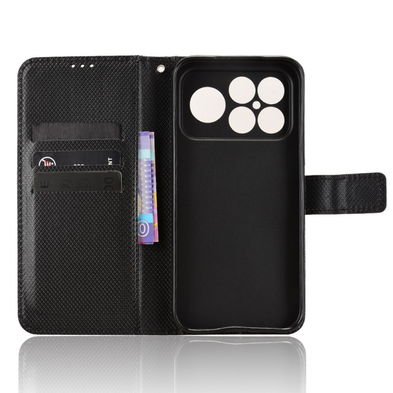 Descubra a nossa elegante capa tipo carteira com textura de diamante para o seu Poco F8 Ultra. Inclui vários compartimentos para cartões e dinheiro, um fecho magnético seguro e um suporte dobrável integrado. A alça de mão incluída facilita o transporte.