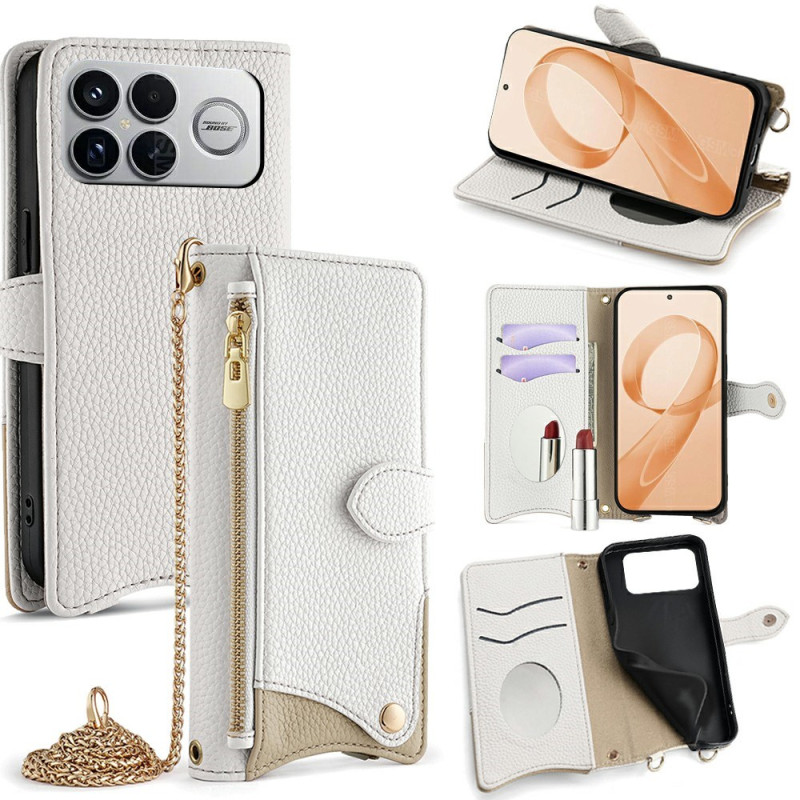 Capa elegante com design irregular em cauda de peixe para o Poco F8 Ultra. Inclui 2 compartimentos para cartões, espelho de maquilhagem, bolso com fecho e alça de ombro amovível com corrente de 1,2 m.