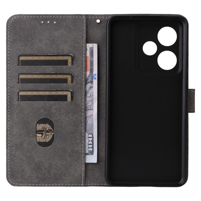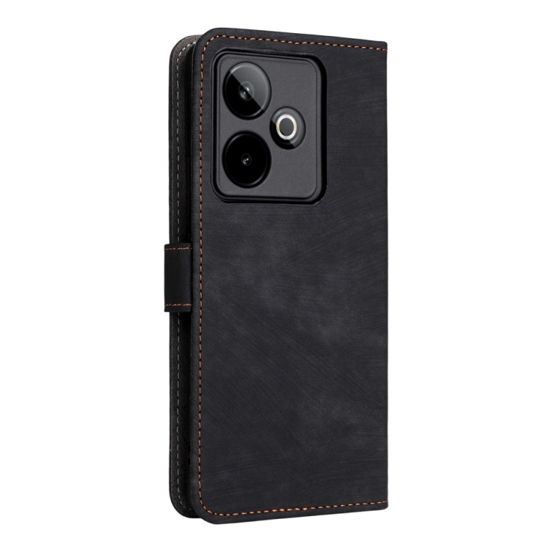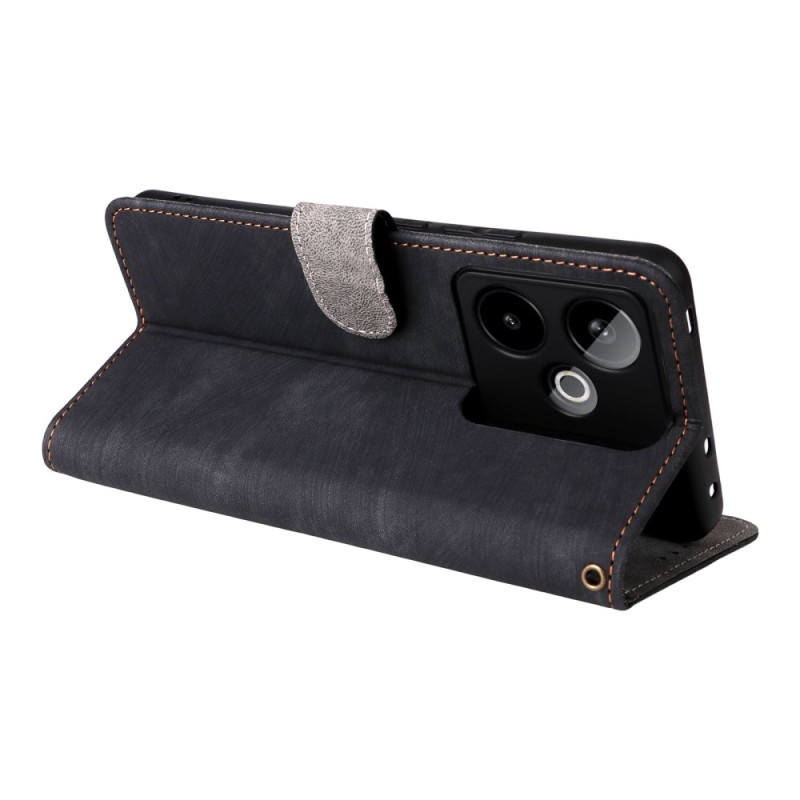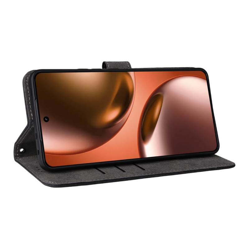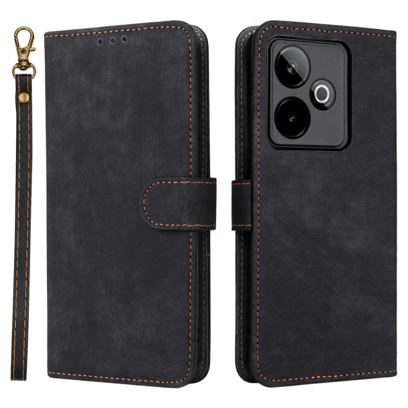 Capa multifunções para carteira para o Realme GT 7 5G com proteção RFID integrada. Inclui 3 ranhuras para cartões, 1 bolso para dinheiro e um suporte para mãos livres. Possui um fecho magnético seguro e uma prática alça de mão para facilitar o transporte.