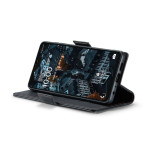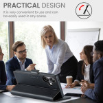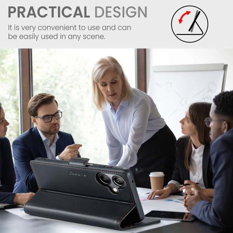 Esta capa em couro PU e TPU oferece proteção completa com tecnologia de bloqueio RFID, armazenamento de cartões e bilhetes, suporte para visualização em mãos-livres e fecho magnético duplo.