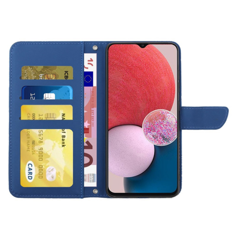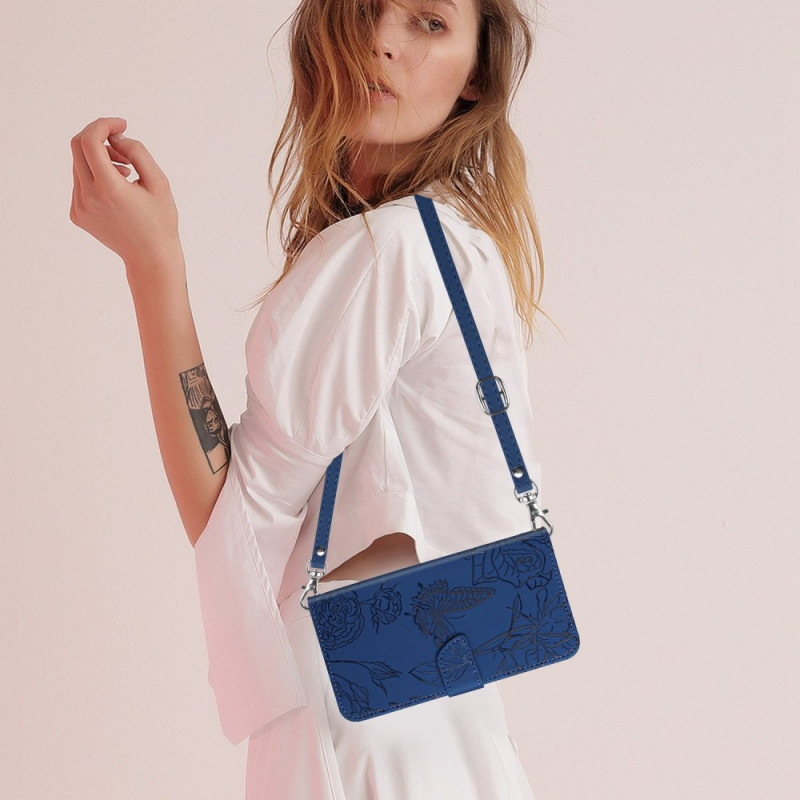 A capa de couro falso Butterflies vem com uma alça de ombro ajustável para transportar o Samsung Galaxy A13.