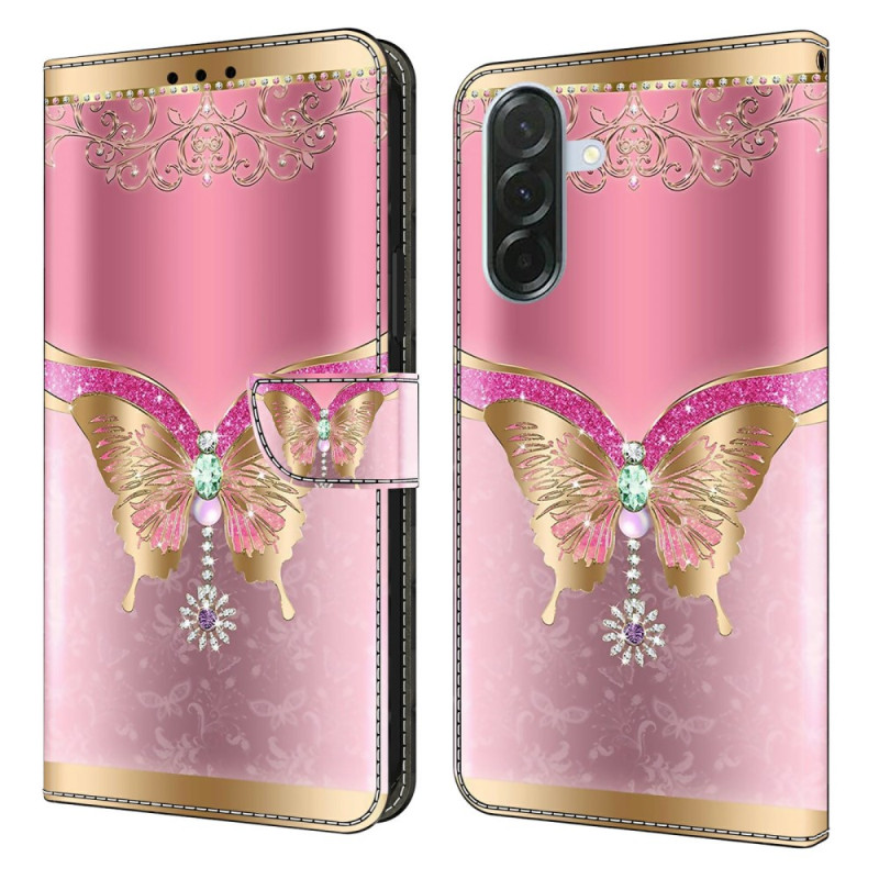 Étui portefeuille élégant pour Samsung Galaxy A37 5G avec un magnifique motif papillon 3D rose et or. Doté de fentes pour cartes, d'un support intégré et d'une fermeture magnétique sécurisée pour une protection complète et un style raffiné au quotidien.