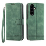 Capa elegante em pele PU com motivo de linhas impressas para Samsung Galaxy A57 5G. Design prático com ranhuras para cartões, compartimento para bilhetes, função de suporte e fecho magnético seguro. Inclui uma correia de mão para facilitar o transporte.