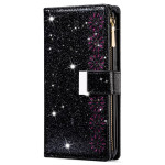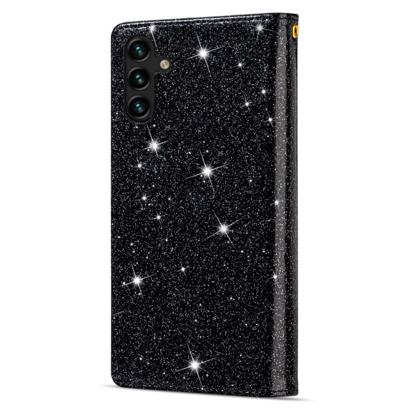 Capa elegante para carteira para Samsung Galaxy A57 5G com um design de céu estrelado gravado a laser e brilhantes. Inclui ranhuras para cartões, bolso com fecho e uma prática alça de mão para um transporte seguro.