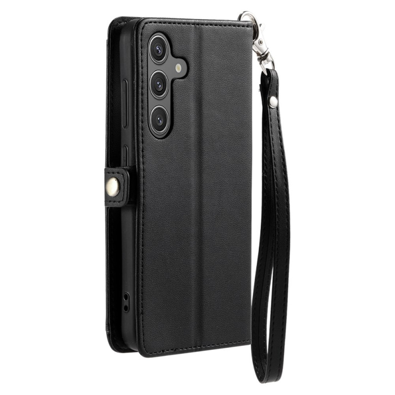 Proteja o seu Samsung Galaxy A57 5G com estilo com esta capa multifunções para carteira. Com 3 ranhuras para cartões, um compartimento para notas e uma prática correia de pulso, combina elegância e praticidade para uma utilização quotidiana.